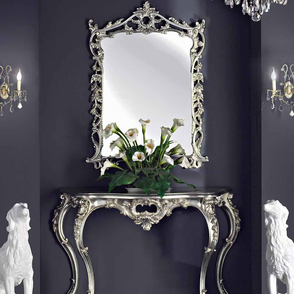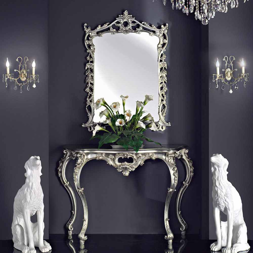 Pragt af italiensk barokdesign i dette storslåede spejl med konsol. Hver kurve og frise er dygtigt skulptureret for at fange lyset og fortrylle blikket og forvandle spejlet til et sandt kunstværk. Over konsollen forstærker spejlet ikke kun rummet, men afspejler også skønheden i det omgivende miljø.