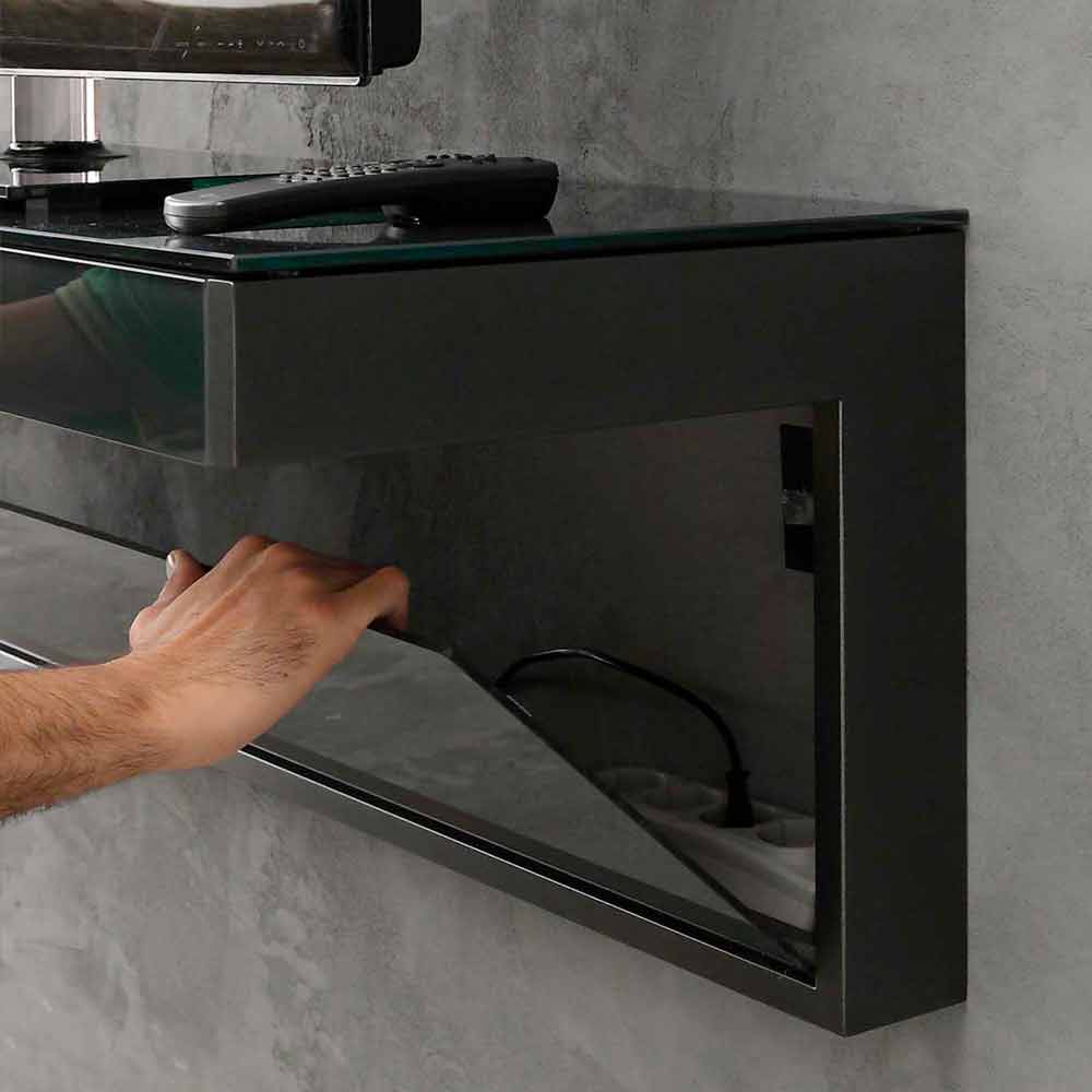 Eksklusiv ophængt tv-skab (vægmontering) fremstillet i Italien med blank sort glasplade med kabelhul, mat sortlakeret metalstruktur og aftageligt lodret plexiglaspanel . Det er også komplet med en aftagelig forreste skuffe placeret under toppen.