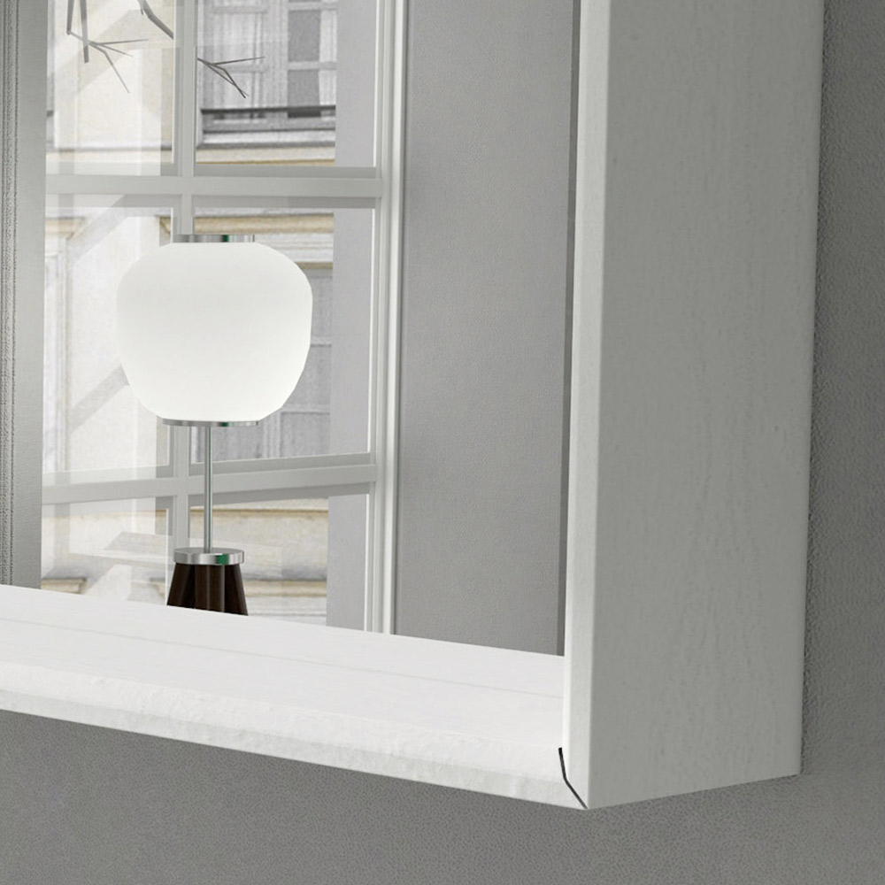 rektangulære designvægsspejl, der fås i to størrelser, er kendetegnet ved sin elegante kasseformede ramme i mathvidlakeret træ, der giver det et moderne og originalt look.