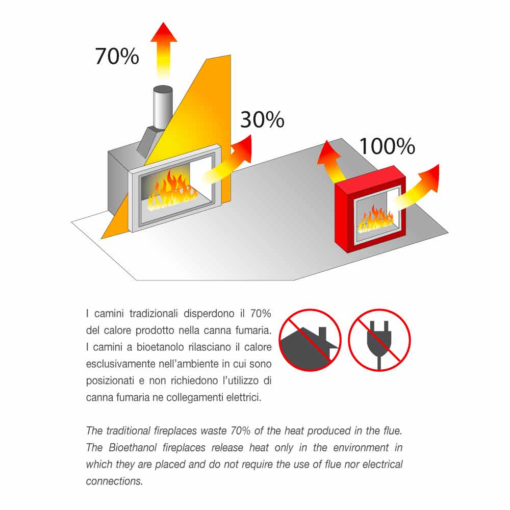 I modsætning til traditionelle pejse, der spreder 70% af den producerede varme i røgrøret, er der i bioethanolpejse ingen varmespredning, da der ikke er nogen røgrør eller elektriske forbindelser, og derfor er effektiviteten 100%.