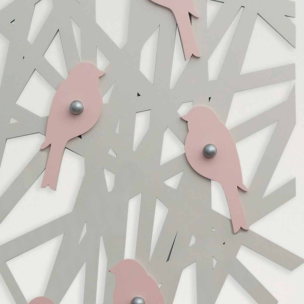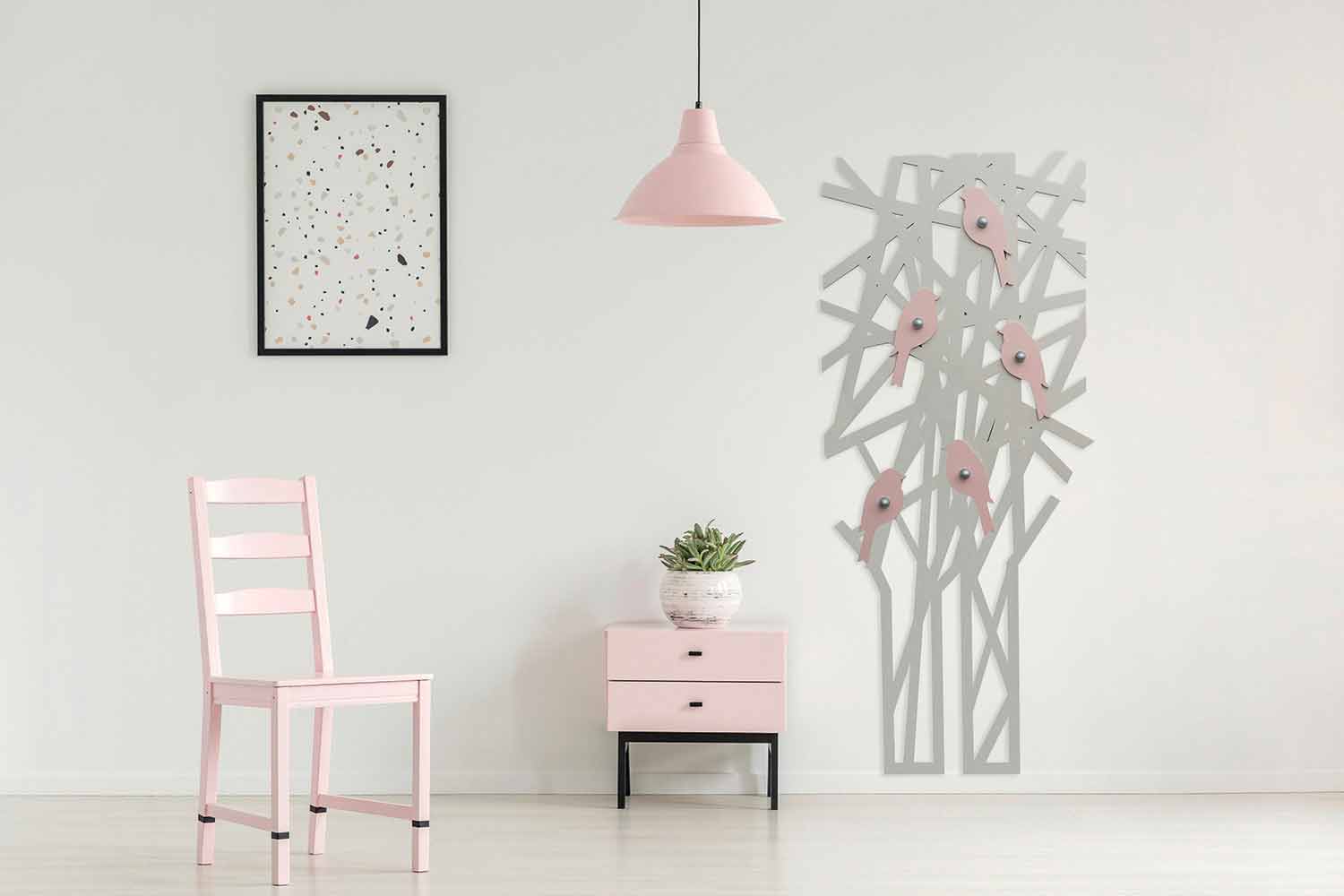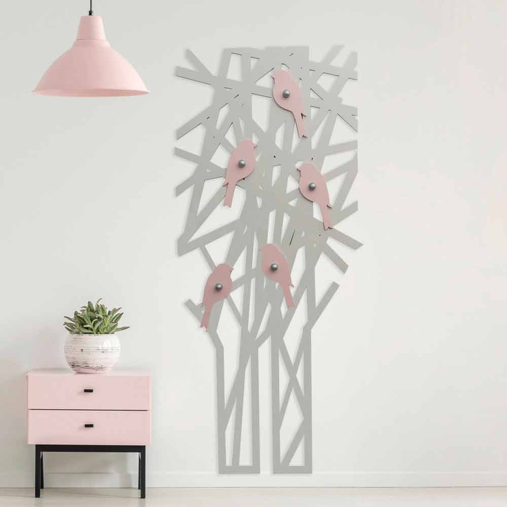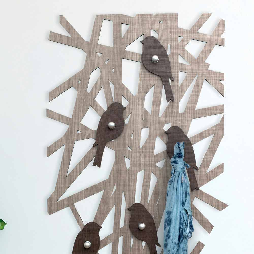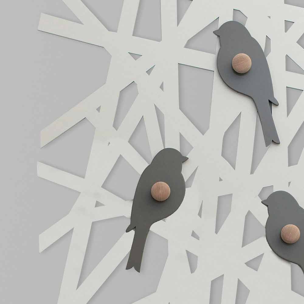 Vægbøjle til indgang, moderne design i form af et stiliseret træ med fugle, fremstillet i Italien.