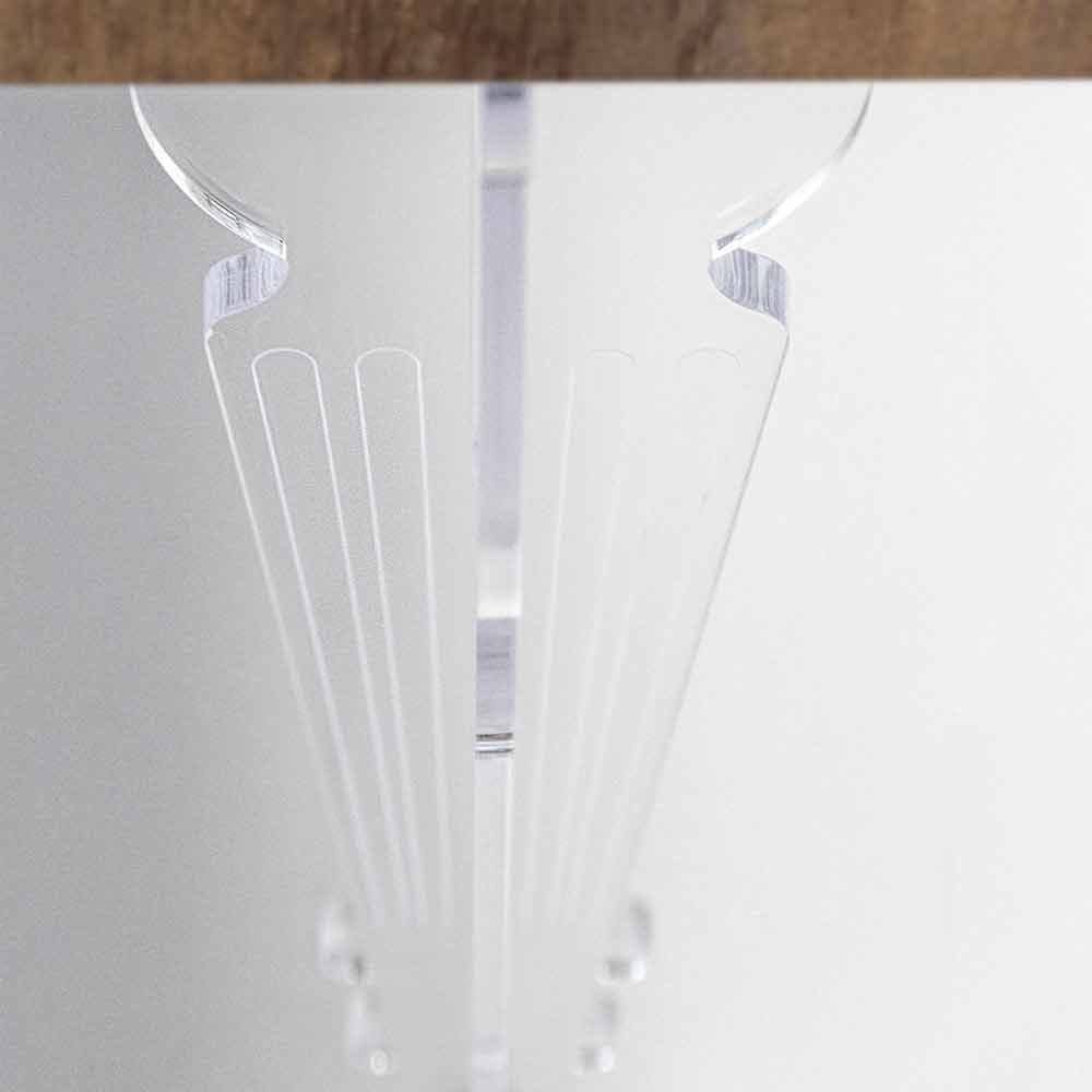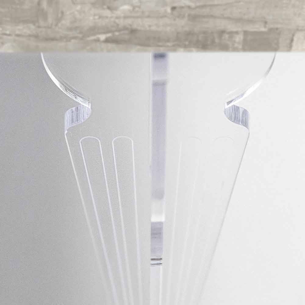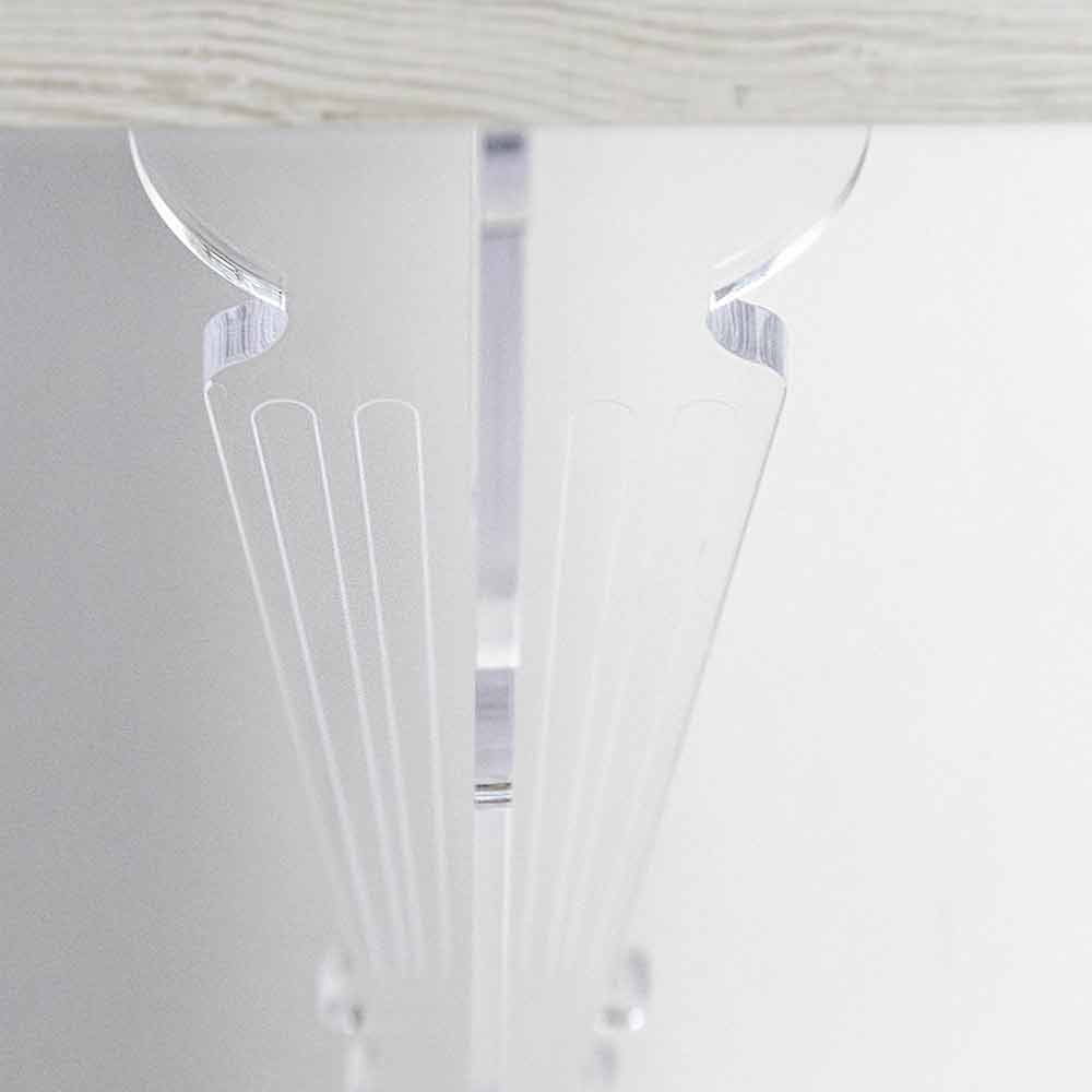 drejede ben i ren PMMA plexiglas fra jomfru akrylkrystalpolymer kombineret med toppen i melamin træ essens med en naturlig mat børstet finish skaber en effekt af