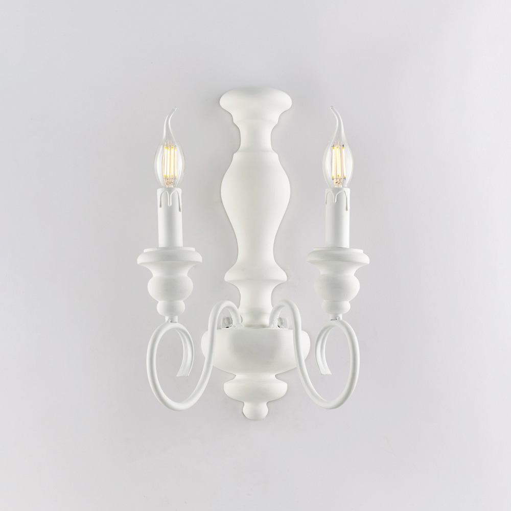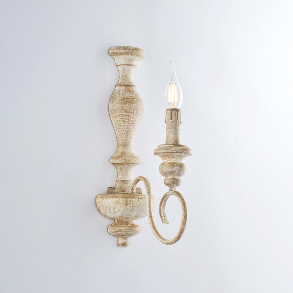 Denne håndlavede væglampe i træ og jern er elegant og harmonisk og fortolker shabby chic- stilen på en elegant måde, der kombinerer klassiske former og delikate finish. Den slanke struktur, fremhævet af bugtede arme og stearinlys , giver væggene en let og tidløs elegance, der er ideel til at skabe varme og indbydende atmosfærer.