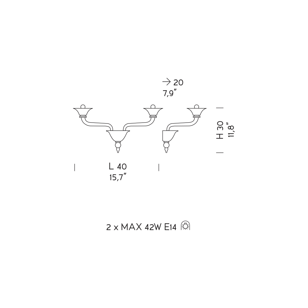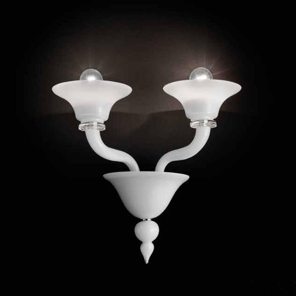 2-lys væglampe lavet i Italien i Venedig glas med mælkehvid finish - håndlavet krystal med metaldetaljer i poleret krom finish . Et hidtil uset møde mellem historiske linjer og moderne design for at give liv til et møbel med tidløs charme og elegance. Dens æstetik er kendetegnet ved et artikuleret volumen , der bliver dynamisk og let gennem den lysende vibration af de vidunderlige blæste glasoverflader, der veksler mellem de elegante gennemsigtige arme med kopperne lavet ved brug af hylsterteknikken . For at understrege dets værdi er opmærksomheden på detaljer, der kommer fra de forkromede metalkomponenter, som gør det muligt for produktet at tilpasse sig forskellige smage og brugssituationer.