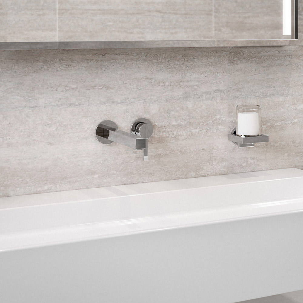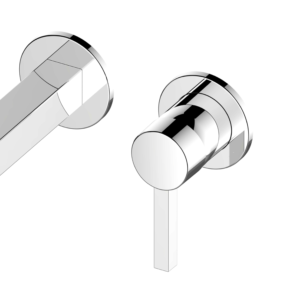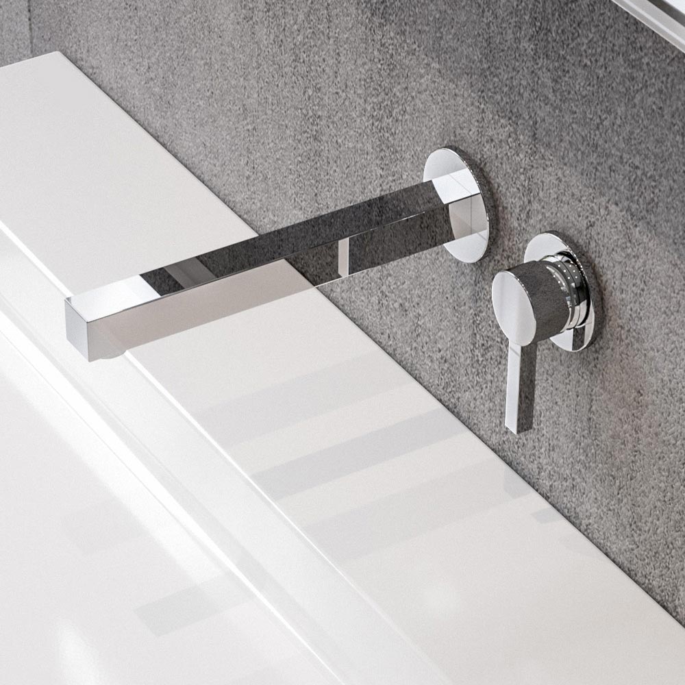 Denne vægmonterede etgrebs håndvaskarmatur har et firkantet design på runde elementer. Det er en vandhane med rene og essentielle geometriske linjerlavet af forkromet messing med materialer af høj kvalitet.