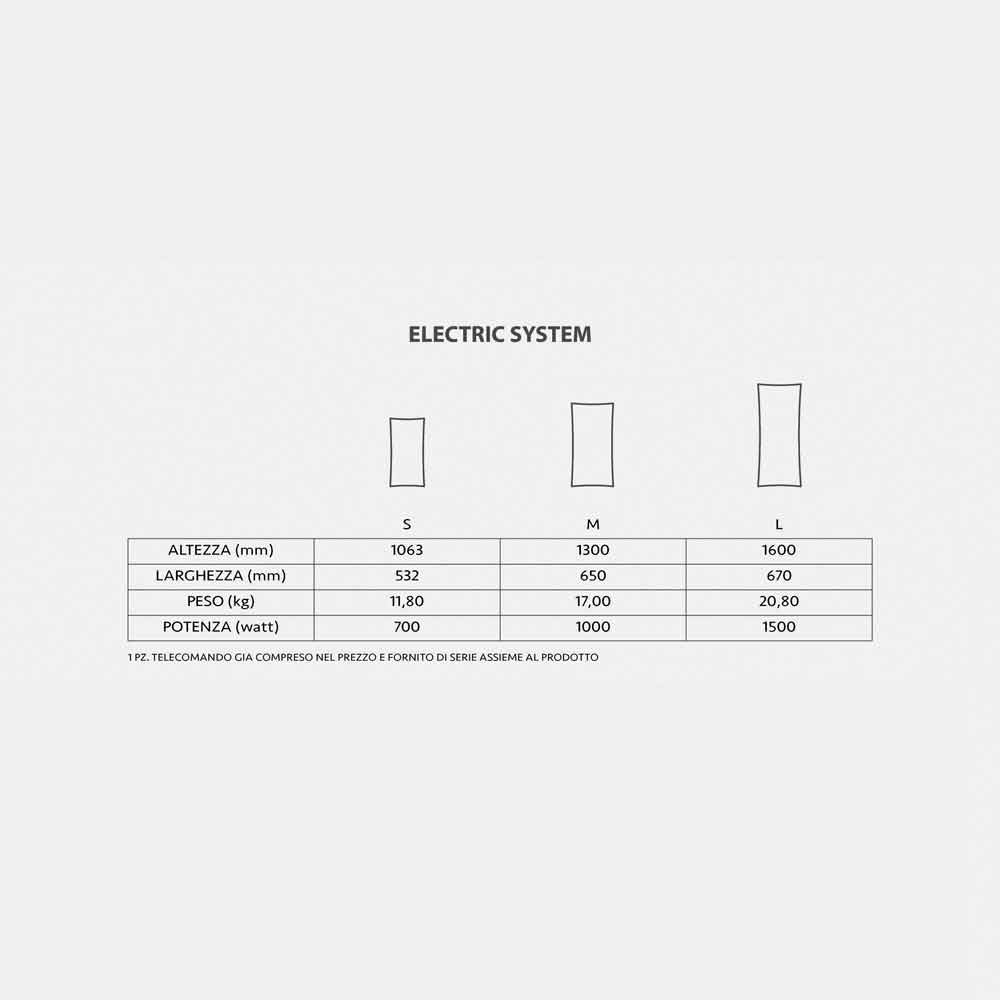 Dette produkt er udstyret med et varmesystem, der giver dig mulighed for at opvarme miljøet hovedsageligt ved stråling, dette giver dig mulighed for direkte at opvarme de tilstedeværende elementer i rummet, som igen genindfører deres varme i miljøet. Denne procedure gør det muligt at have en behagelig omgivelsestemperatur med en lufttemperatur, der er meget lavere end traditionelle systemer, og en grad mindre af lufttemperaturen svarer til en besparelse på mindst 7 % af energiforbruget.