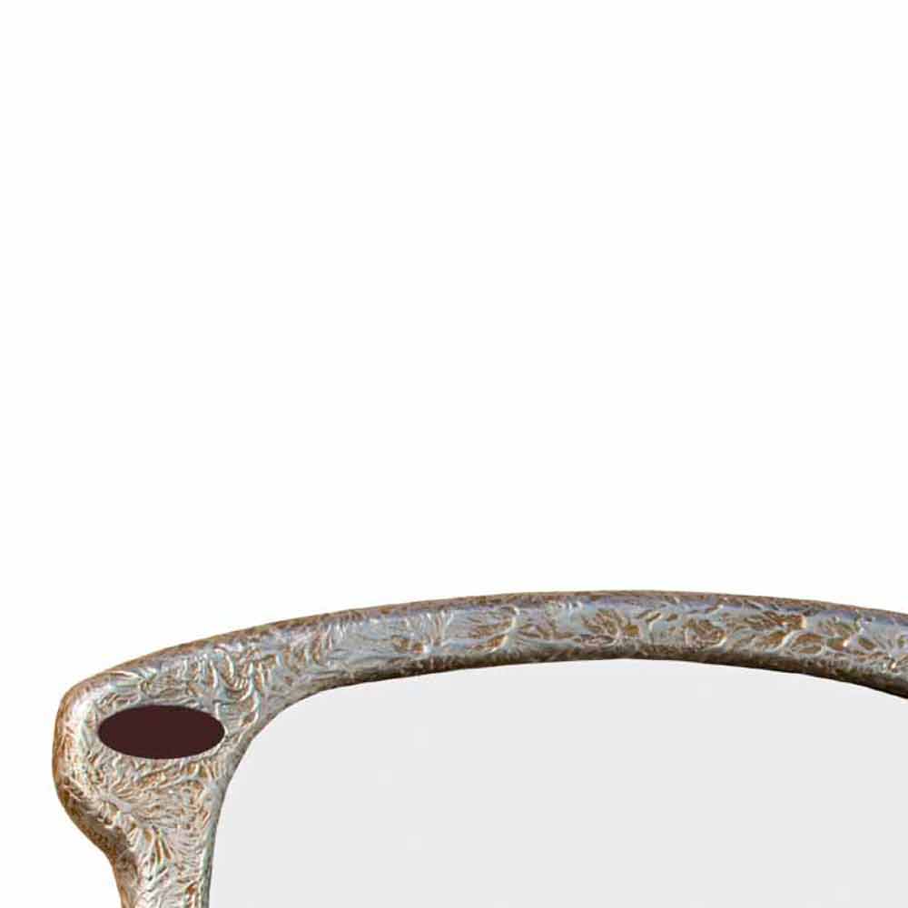 Spejl præget af stor stil og elegance. Lavet af MDF, et meget modstandsdygtigt og uforanderligt materiale over tid, med formet struktur og håndindrettet med sølvblad på tekstureret materiale, behagelig at røre og behageligt at se.