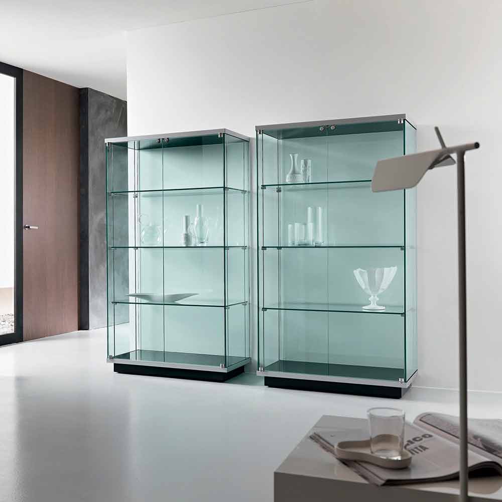 To-dørs vitrineskabet med lås er udelukkende lavet af gennemsigtigt hærdet glas med tre hylder med bund, top og sokkel i sortlakeret træ.