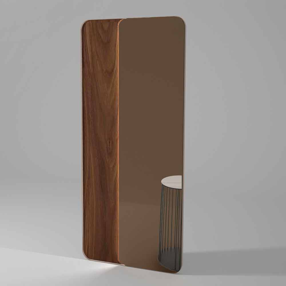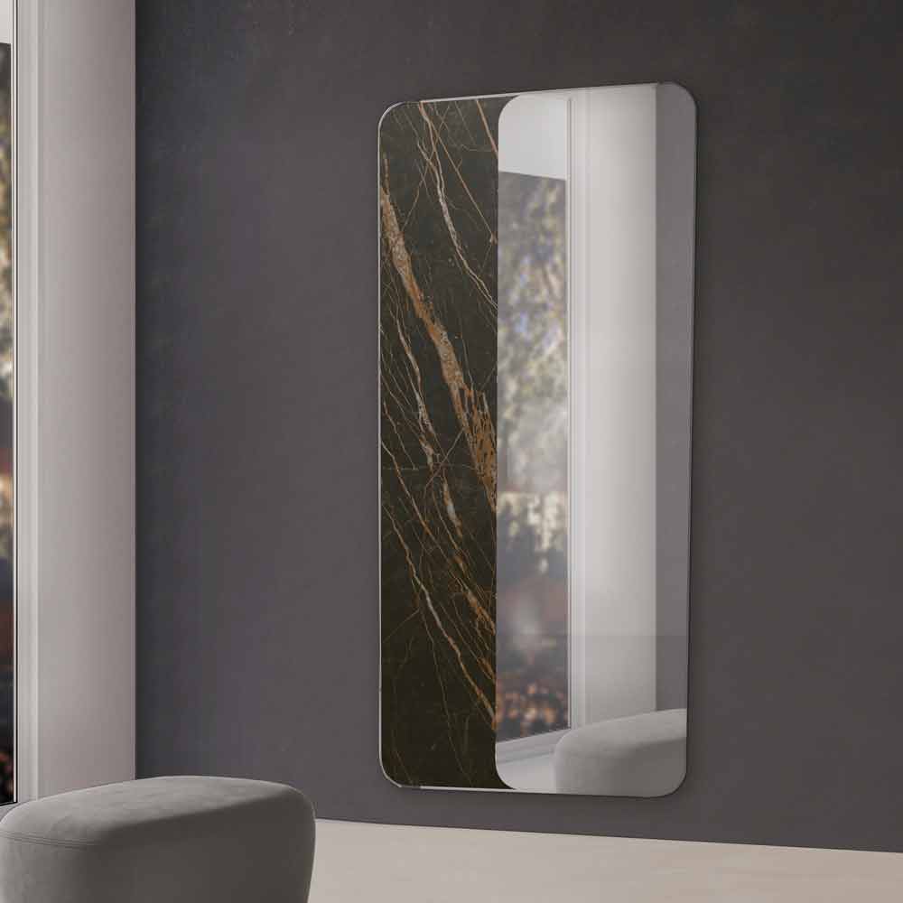 Vægspejl helt lavet i Italien bestående af en ydre ring i metal og en sideindsats i keramik eller træ komplet med et spejl belagt i bronze eller sølvfinish. Et