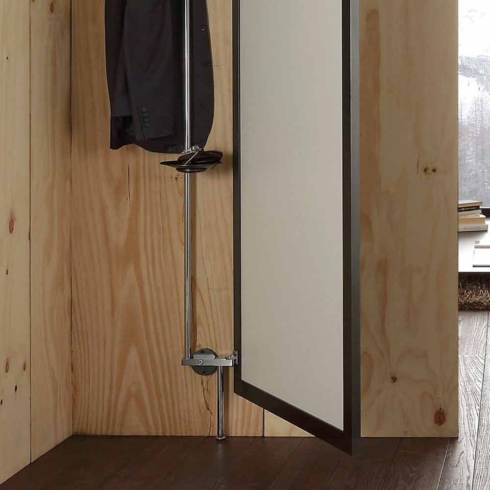 Innovativt vægspejl i røget glas med åbning fremstillet i Italien med sortmalet metalramme komplet med forkromet metalvægssystem inklusive 3 kapper og en praktisk opbevaringsplade. Et ekstremt simpelt og essentielt design kombineres med en original og innovativ idé, hvilket giver liv til en funktionel møbleløsning, der er i stand til at tilpasse sig ethvert miljø, inden for hvilket det skaber et skjult rum til at være dedikeret til organisering af forskellige objekter. Dens struktur er designet til hjørnerummet i huset, der ofte ikke bruges, men som kan omdannes til praktiske områder, hvor man kan placere poser, frakker og mere, hvilket lykkes at opretholde et rent og ryddeligt miljø.