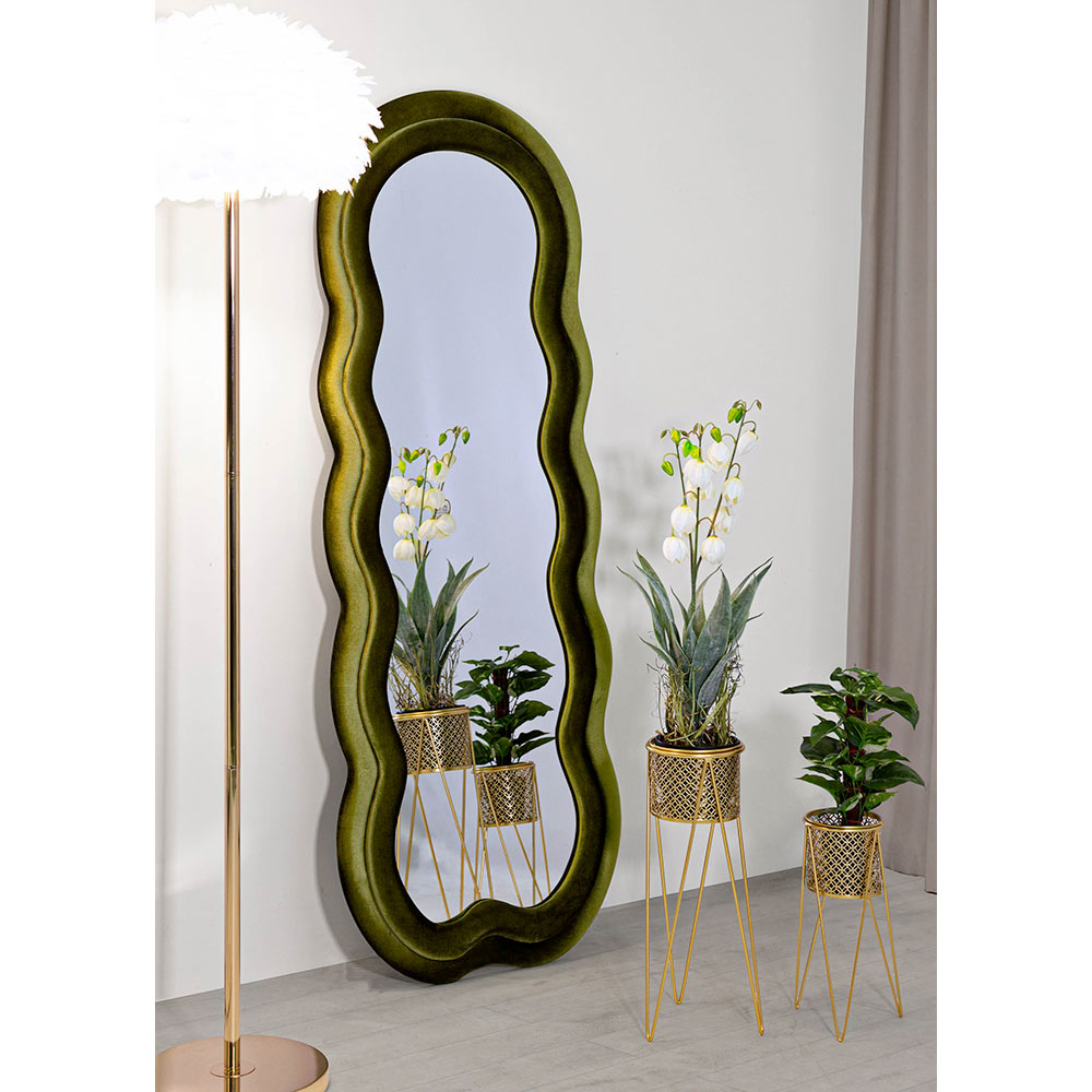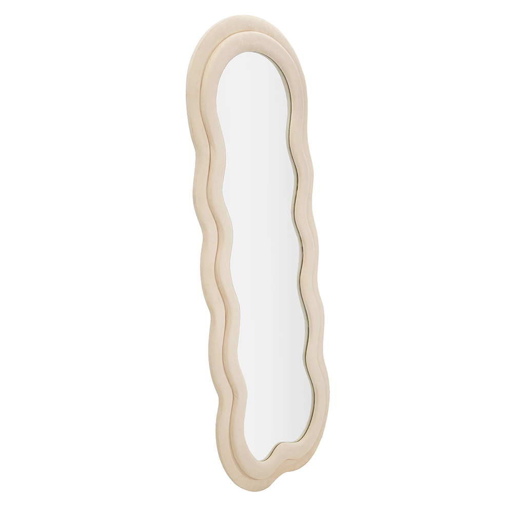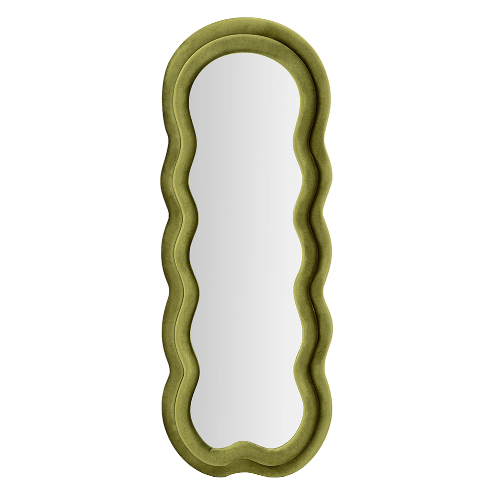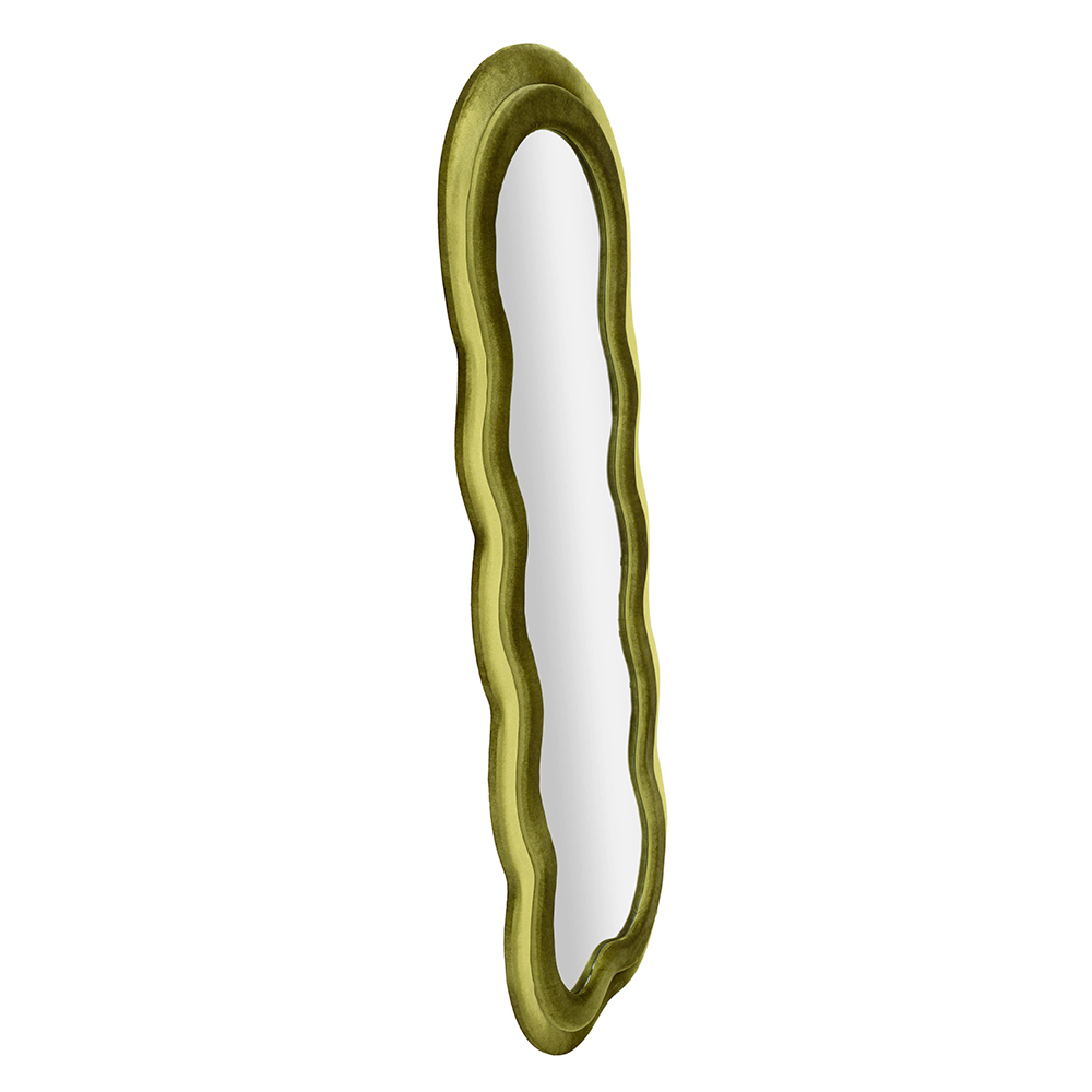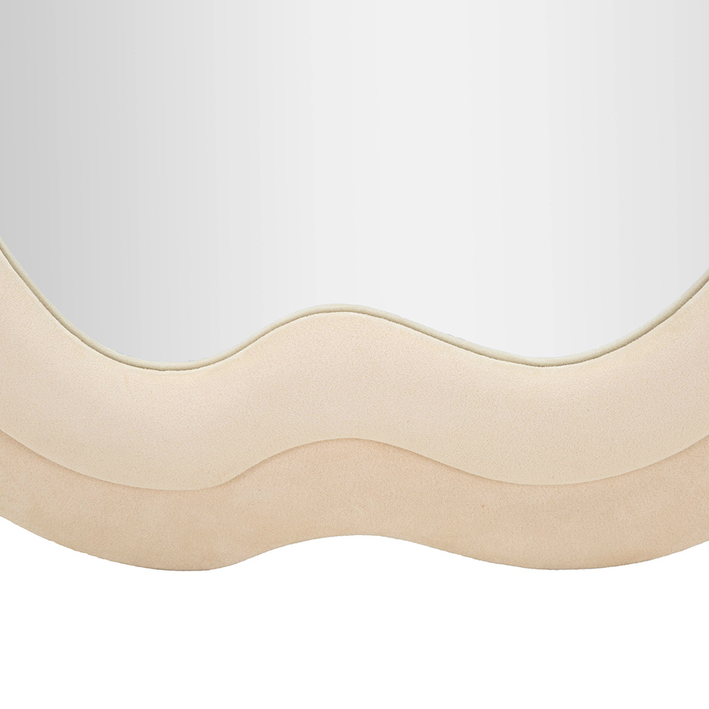 Dette dekorative spejl er et sublimt eksempel på, hvordan møbler kan kombinere funktionalitet og kunstnerisk skønhed . Med sin bølgede ramme og bugtede linjer taler dette stykke et sprog af flydende elegance og moderne design . Fløjlsfinishen forbedrer dens organiske form, hvilket gør den til et perfekt supplement til farvede eller neutrale vægge, der er i stand til at harmonere med en bred vifte af paletter.