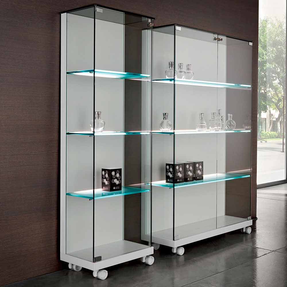 To-dørs vitrineskabet med hjul, der letter bevægelsen, er lavet af gennemsigtigt hærdet glas og en struktur i mat hvidlakeret træ.