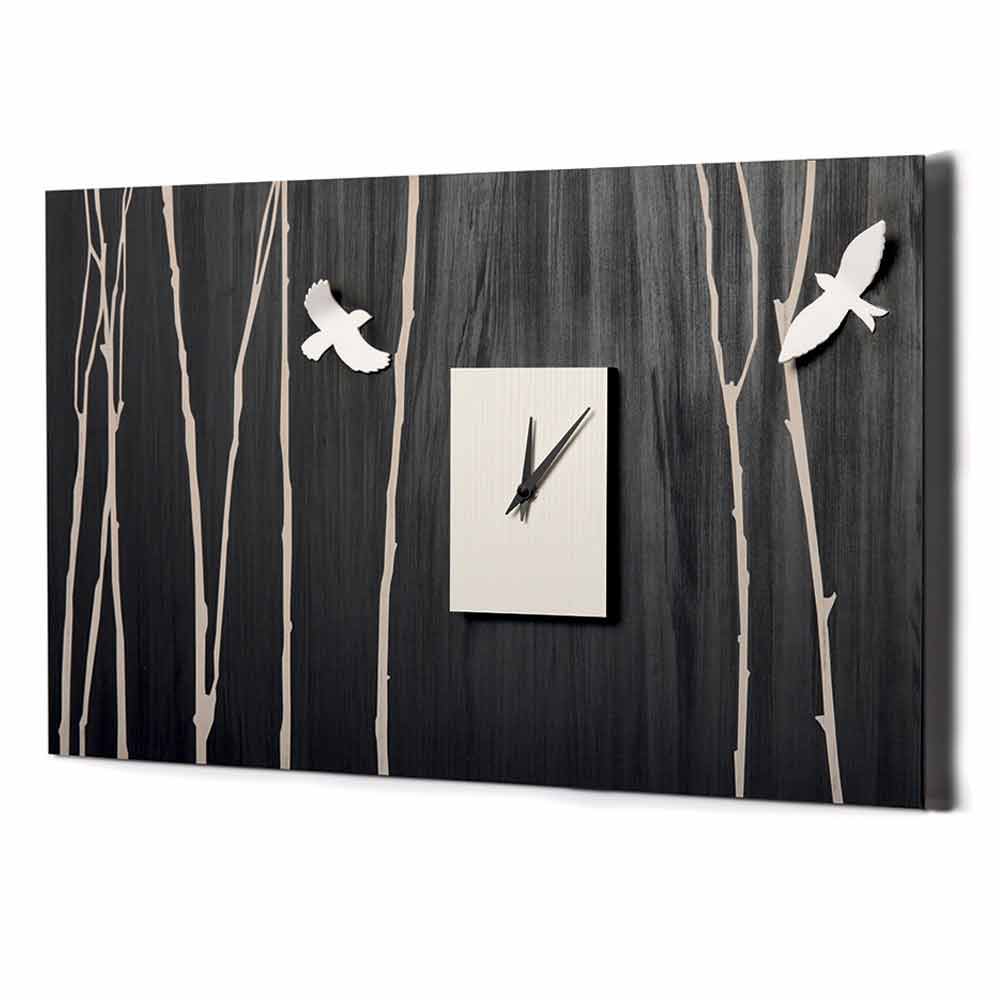 Dette vægur er lavet af tavelfarvet træ med repræsentation af lasermarkerede vintergrene og tredimensionelle dekorationer såsom træfuglehuset og fuglene i uigennemsigtigt methacrylat.