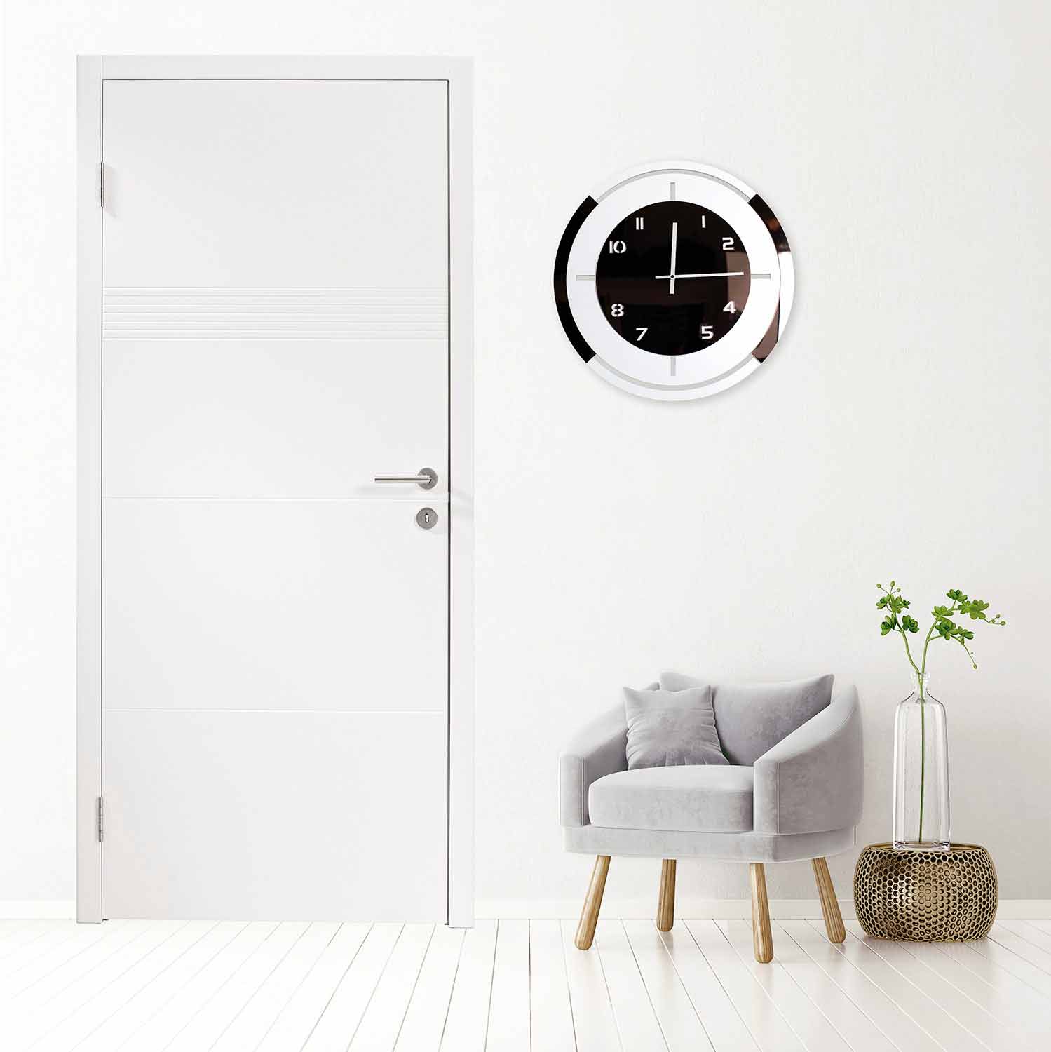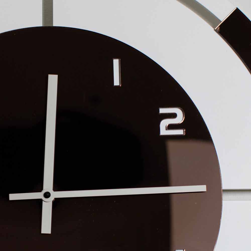 Rundt vægur i hvidlakeret træ med dekorationer i bronze pelxiglas, moderne design lavet i Italien.