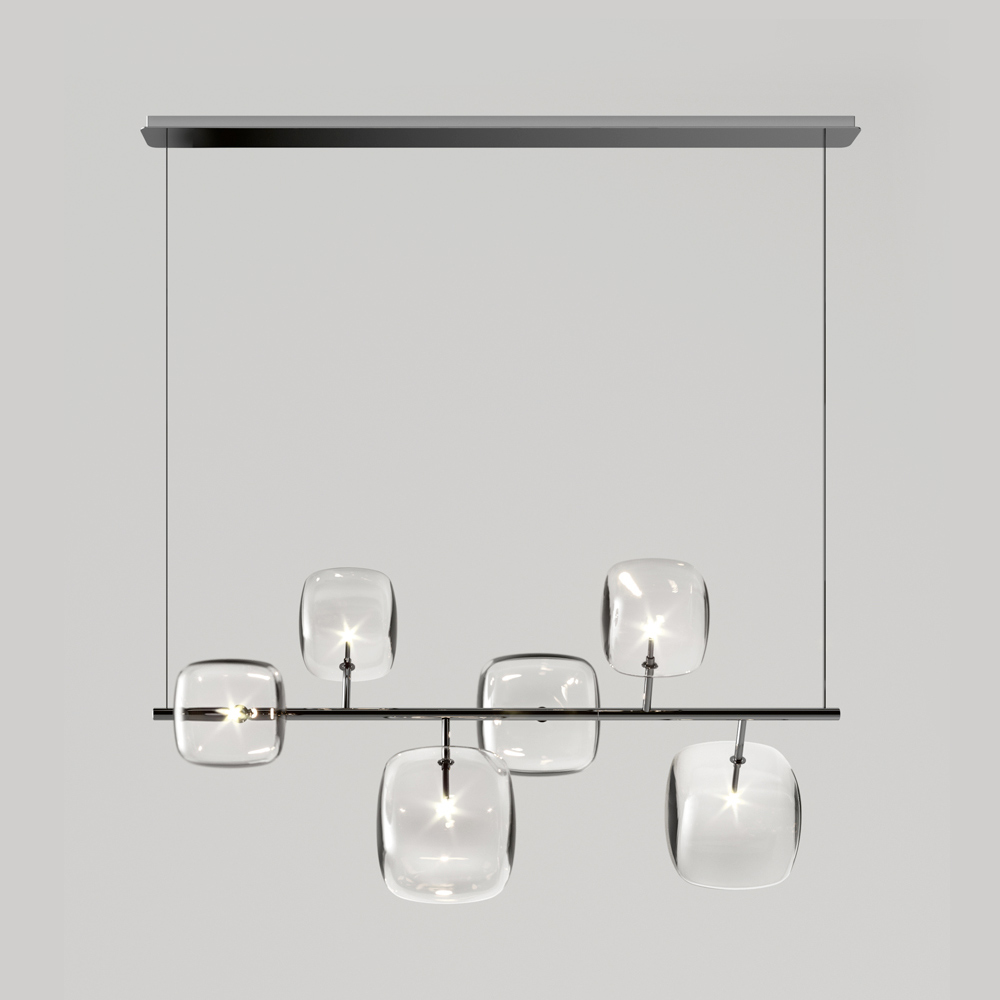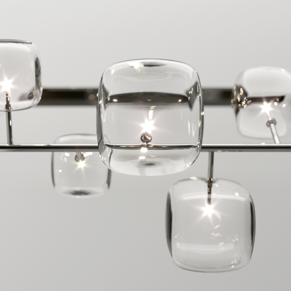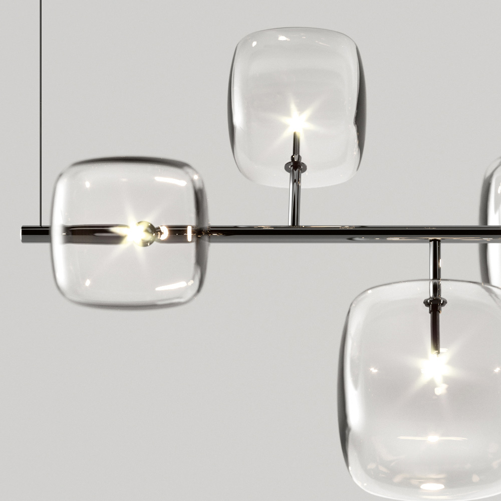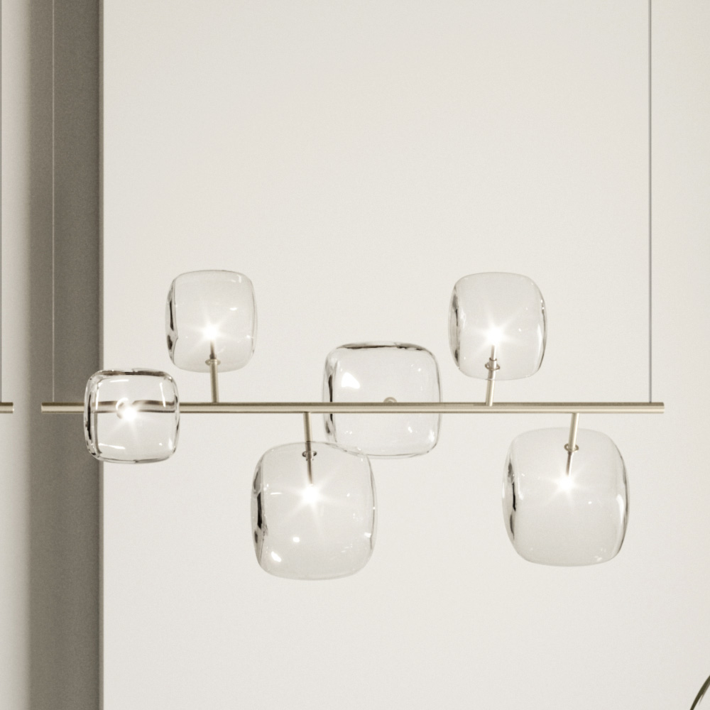 Vandret pendel med metalstruktur og 6 kubiske og afrundede strukturer i gennemsigtigt blæst Pyrex-glas med 1 dæmpbar G4 3000K LED-pære indeni hver.