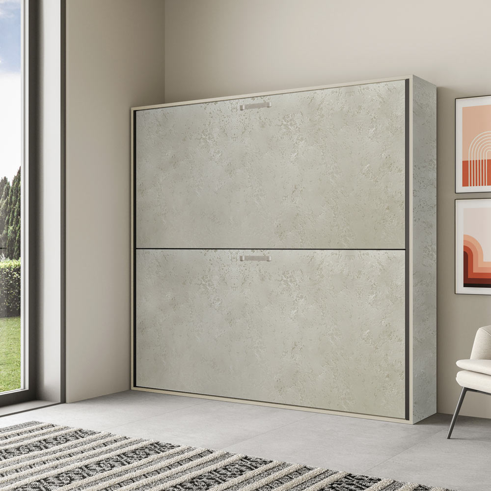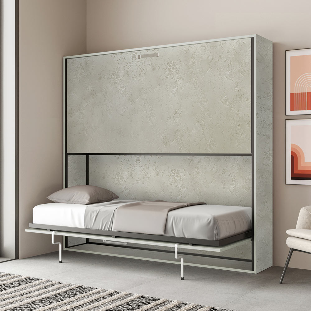 Vandret klapseng lavet med en struktur i 18 mm tykke, forædlede spånplader, sengebund i forstærket jern malet med epoxypulver i præget aluminiumsfarve.