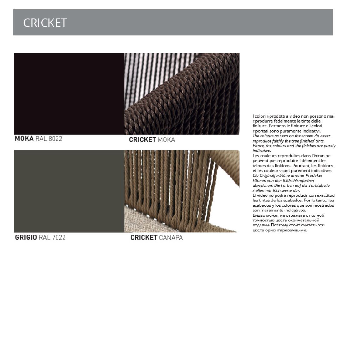 Sæt bestående af 2 sessioner i hånd flettet syntetiske fibre med stel i lakeret aluminium. Stolen Cricket af Varaschin kan bruges som en havestol i opholdsrummet.