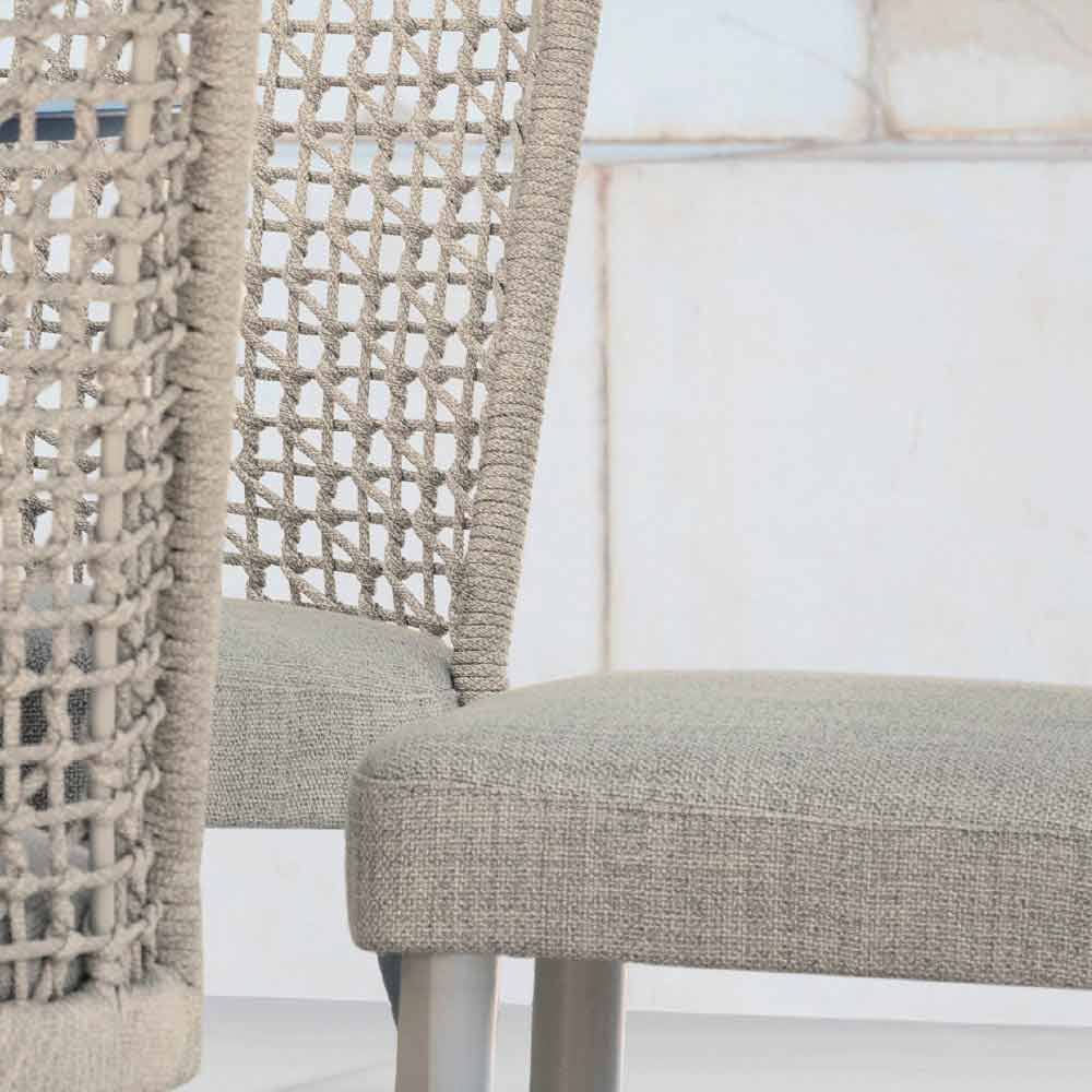 Emma er en udendørs stol kendetegnet ved en struktur i syntetisk fiber håndvævet med beige pulverlakeret aluminiumsramme .
