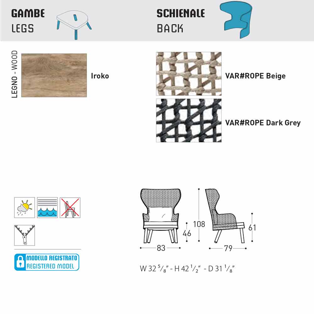 Det leveres også med massive iroko træben og et sæde polstret med Dryfeel gummi dækket af stof.
