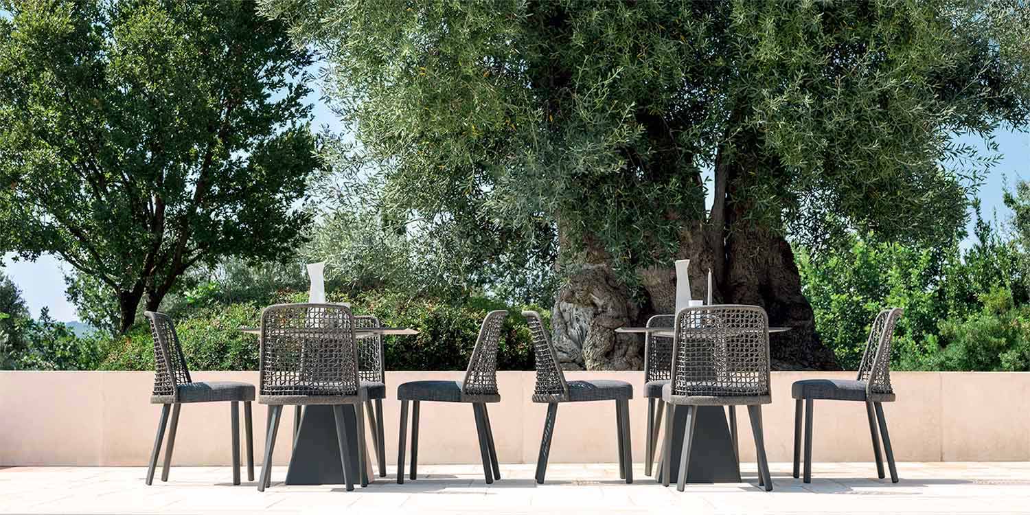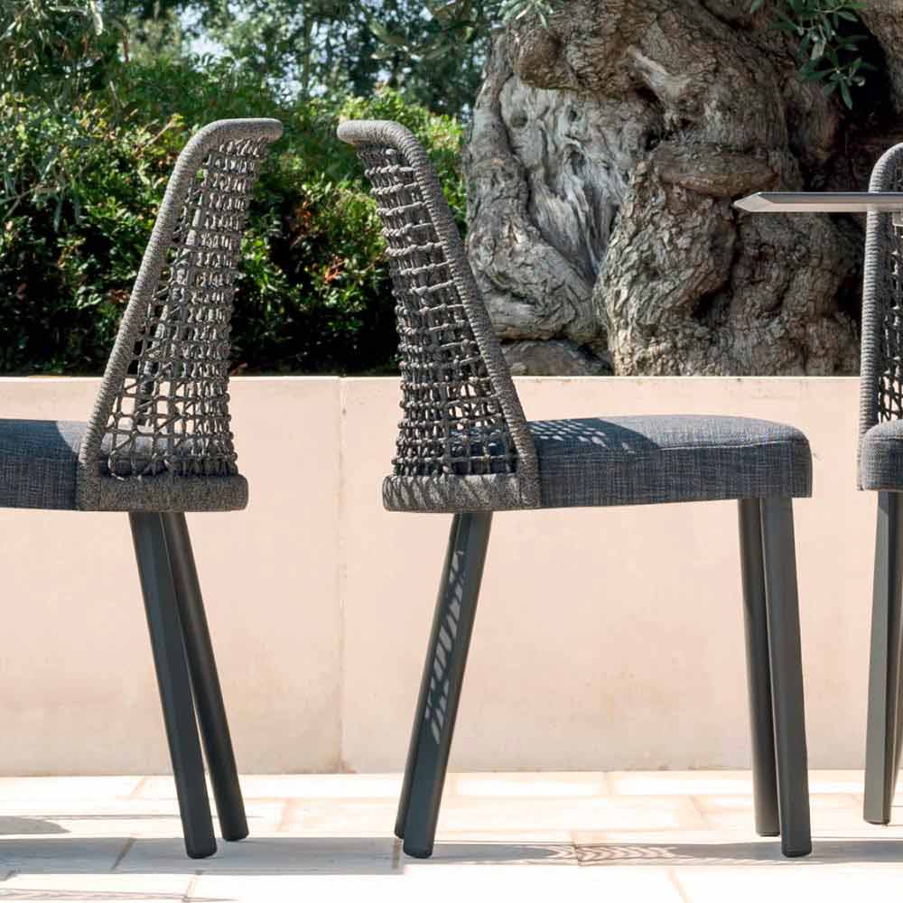 Emma er en have stol stolen af en håndvævet syntetisk fiber struktur med en mørkegrå pulverlakeret aluminiumsramme .