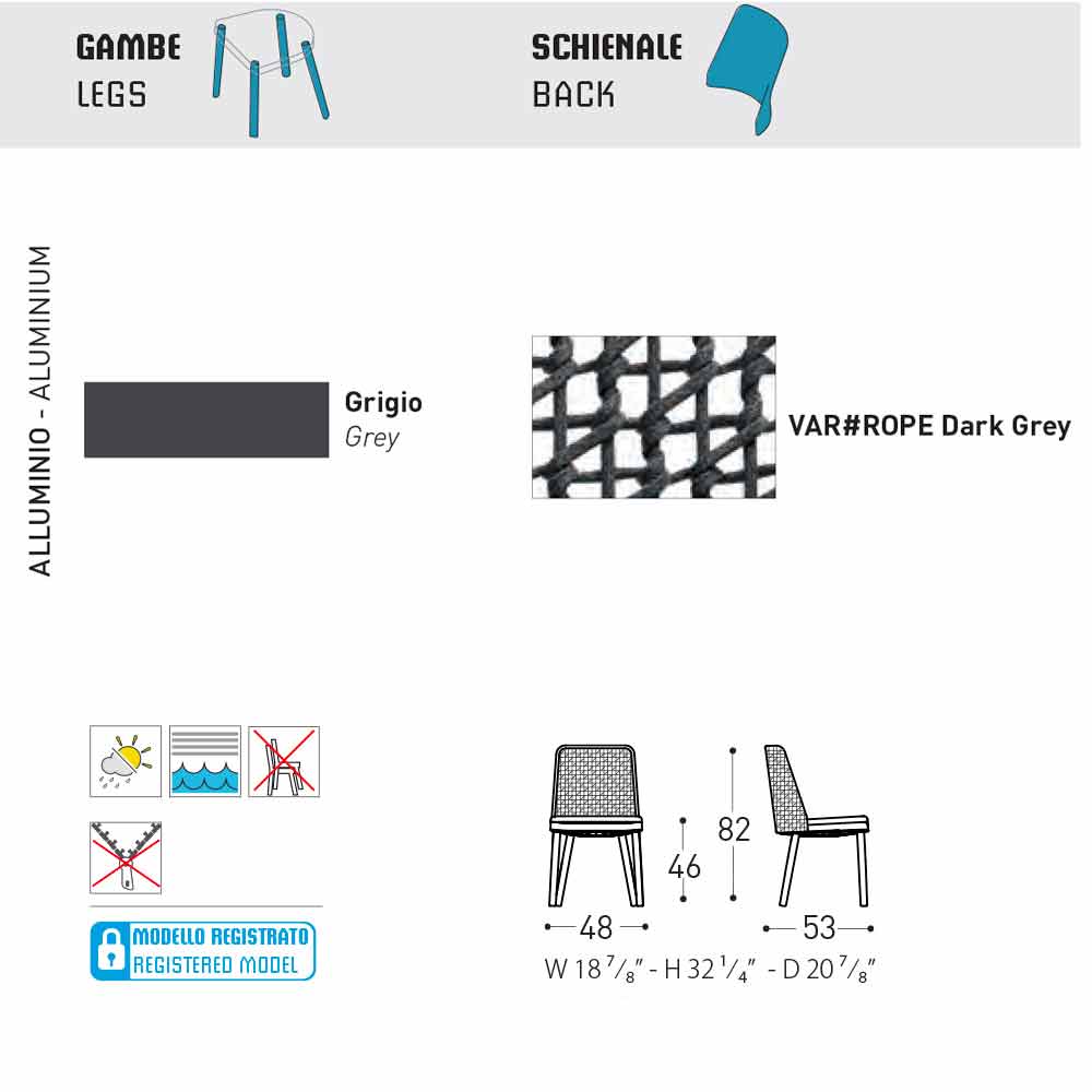 Den leveres også med aluminiumsben malet gråt og et sæde betrukket med stof med en polypropylen sæde struktur.