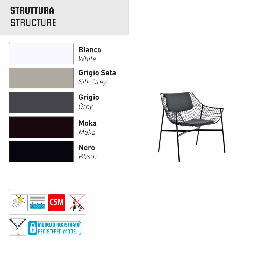 NB . Samlingen støtter sollys og regn. Vi anbefaler regelmæssig vedligeholdelse og særlig opmærksomhed på beskyttelse af genstande i tilfælde af ugunstige vejrforhold (is, hagl, temperaturændringer, fugtighed, vedvarende, fugtig varme eller ekstrem kulde). Varernes holdbarhed og integritet afhænger af den pleje, som de opretholdes. For aluminium og stålprodukter (43, 304Ep, 316), selvom det er beskyttet af behandlinger og færdiggørelser egnet til udendørs brug, er det vigtigt at forhindre vand i at stagnere inde i selve produktet. Faktisk præsenterer alle artikler tekniske perforeringer, der er nødvendige for anvendelse af beskyttende behandlinger og finish. Indførelsen af vand i disse huller og dets stagnation kan forårsage rust på rørets indre dele.
