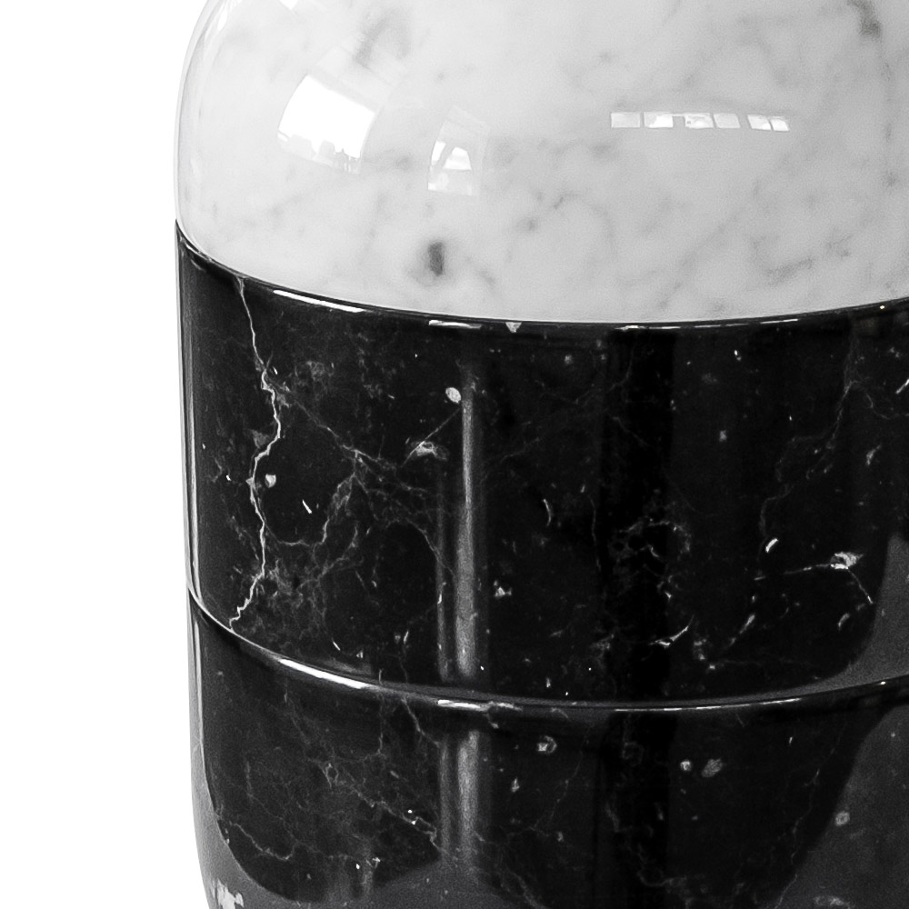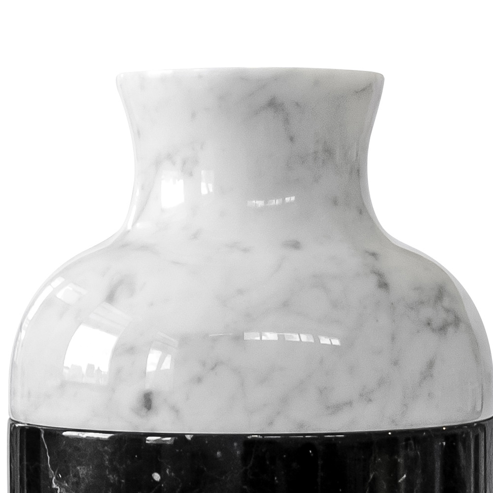 Denne dekorative vase har et håndværksmæssigt og luksuriøst design opdelt i 3 dele, udelukkende lavet af hvid Carrara og sort Marquinia satin marmor.