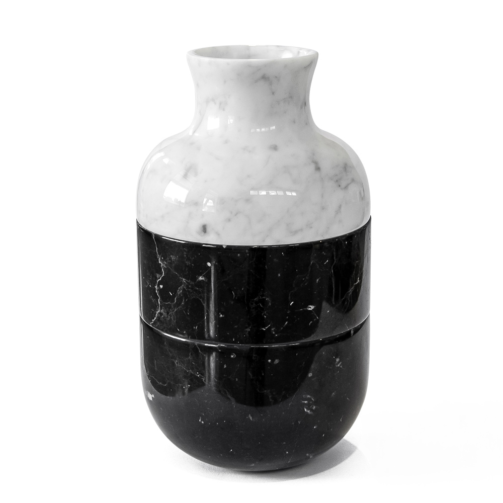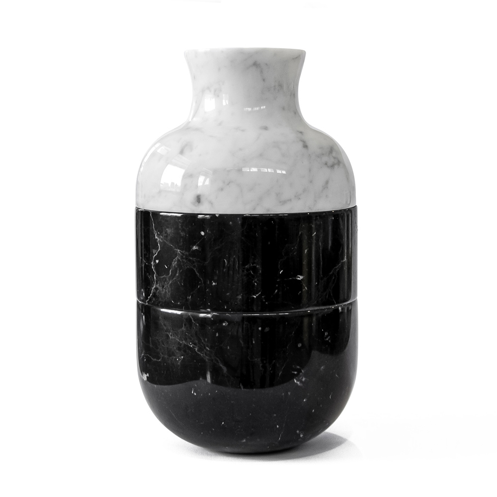 Dekorativ vase i 3 dele i hvid Carrara marmor og sort Marquinia lavet i Italien.
