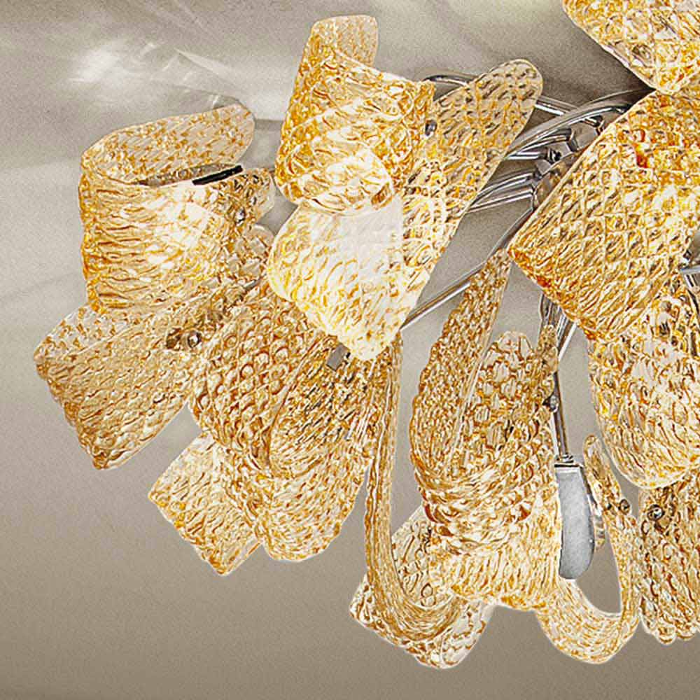 Elegant og majestætisk loftslampe lavet i Italien i håndlavet ravfarvet venetiansk glas med detaljer i poleret krommetal . En idé om belysning sammensat af vellystige bånd og usædvanlige strukturer, der giver dens æstetiske originalitet og en følelse af dynamik . Hvad der er slående er den geometriske struktur, der dækker glasoverfladen, hvorpå lyset reflekteres i metaldetaljerne for vidunderlige refleksionsspil . Resultatet er en vidunderlig loftslampe, der er i stand til at tilpasse sig ethvert moderne miljø og give karakter til mere klassiske rum, hvilket viser sig at være særligt alsidig.
