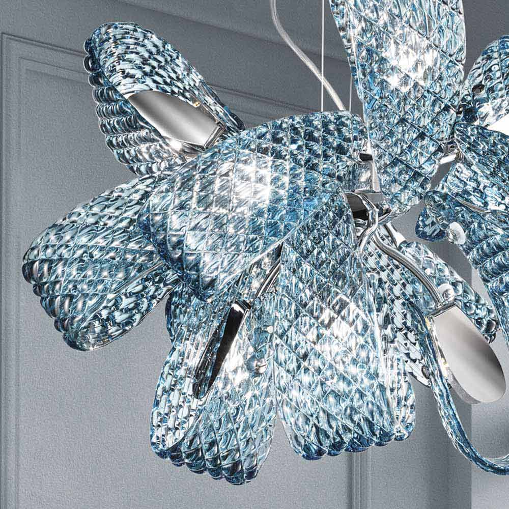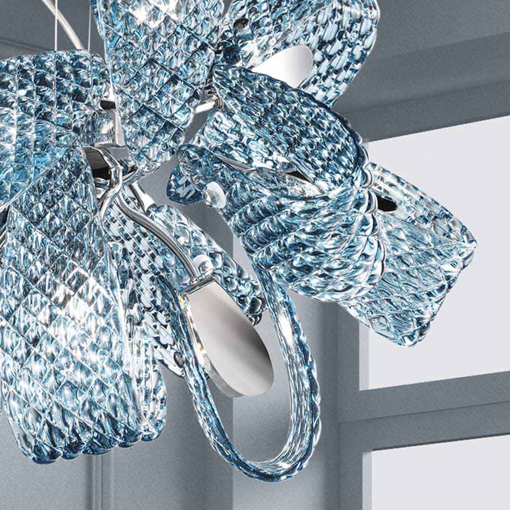 9 lysekrone lys håndlavet i Italien i Venedig med glasfinish i blå finish og detaljer i poleret krommetal. En idé om belysning sammensat af vellystige bånd og usædvanlige strukturer, der giver dens æstetiske originalitet og en følelse af dynamik . Takket være det excentriske og raffinerede design og metalindsatserne, der skaber kontrast til glasset, fødes en eksklusiv lysekrone, der er i stand til at karakterisere ethvert miljø med et strejf af lethed, der giver liv til vidunderlige lysspil .