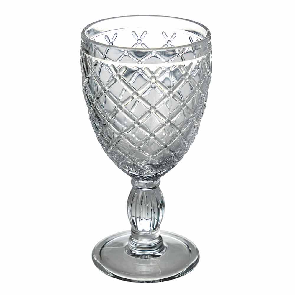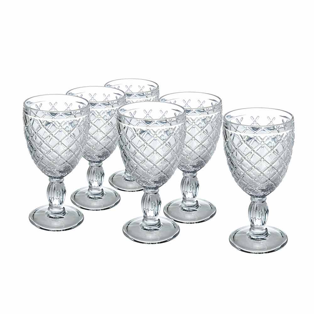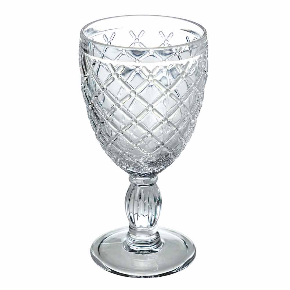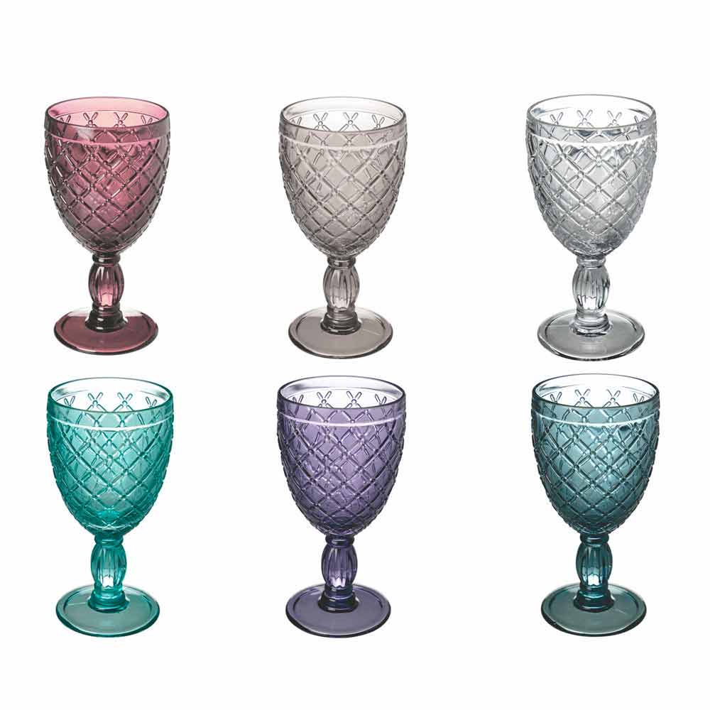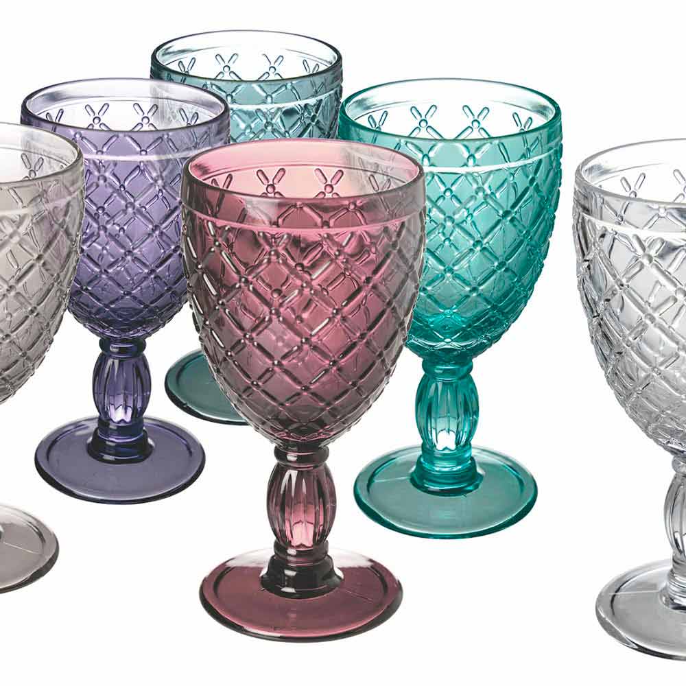Sæt med farvede eller gennemsigtige vin- eller vandbægre i glas med udskårne dekorationer, 12 stk.
