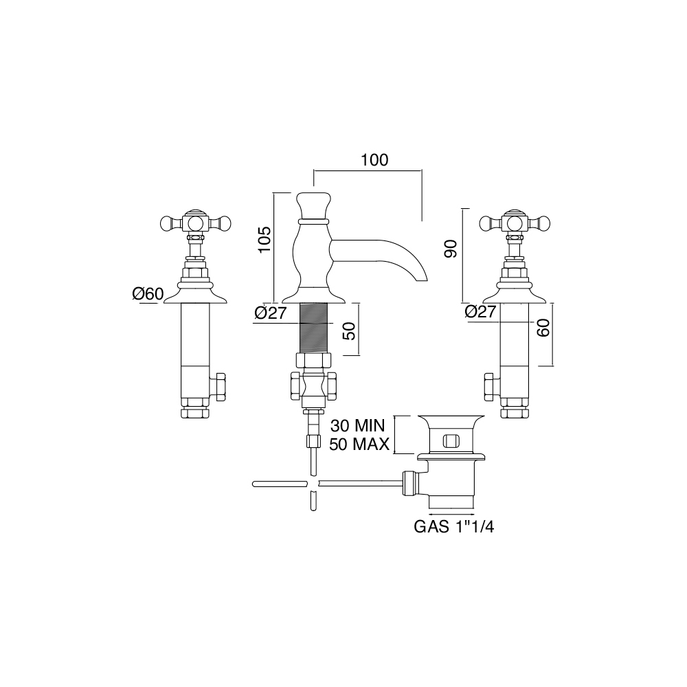 3-huls håndvaskarmatur til vintage design messinghåndvask Elisea, fremstillet i Italien.
