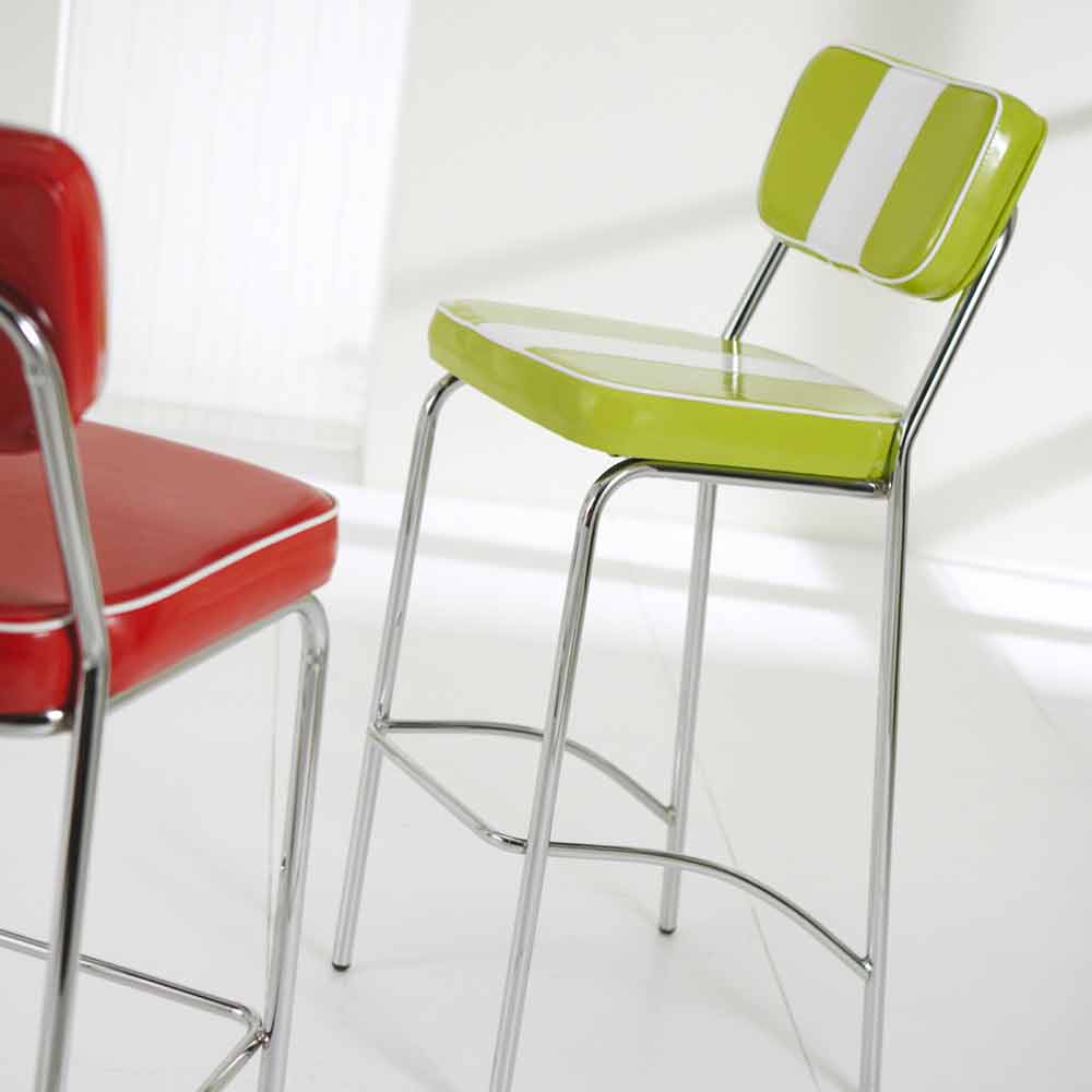 Skammel i 50'erne stil med polstring af graffiti imiteret læder og forkromet struktur.