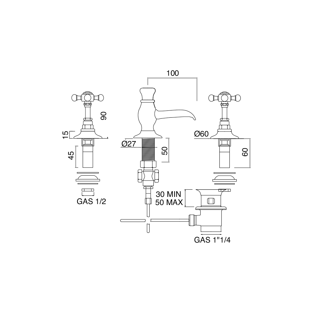 3-hullers bidetarmatur med afløb, fremstillet i messing.