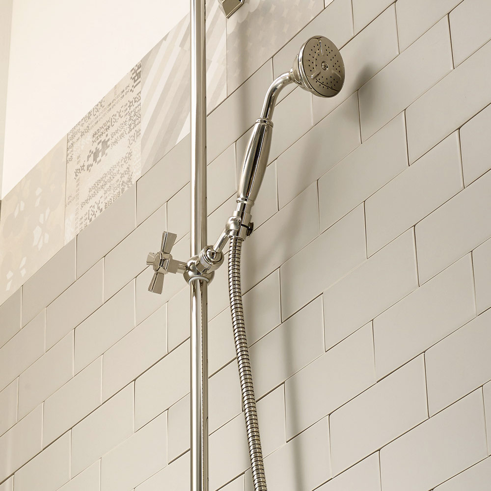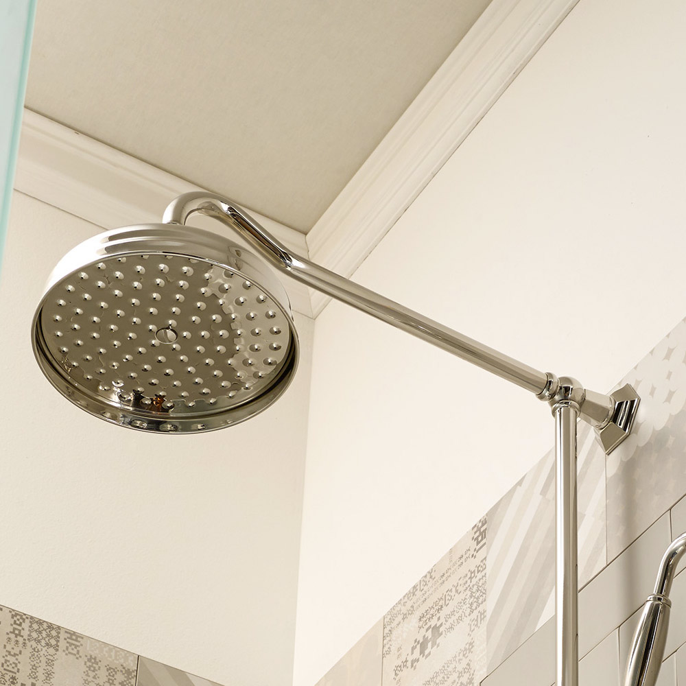 brusegruppe med glidestang, arm og brusehoved, fremstillet i messing.