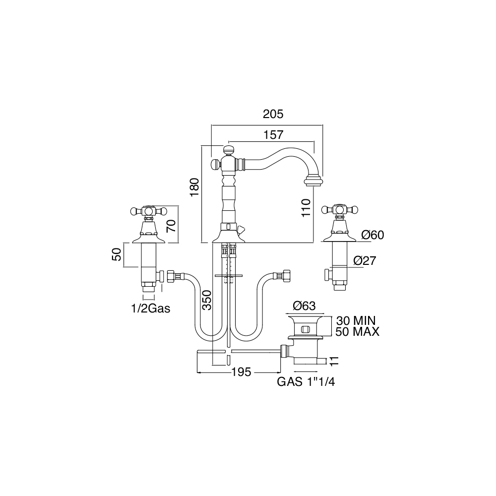 3-hullers håndvaskarmatur med afløb, fremstillet af messing.