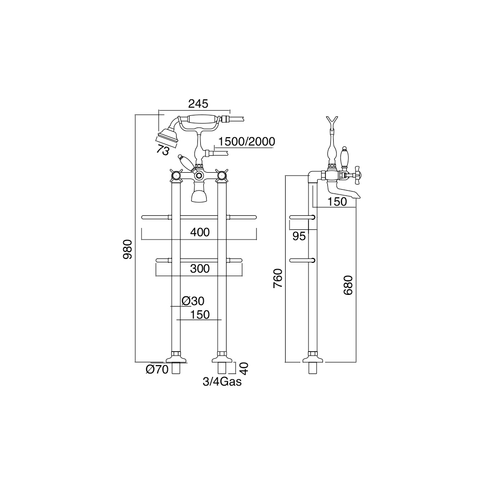 gulvbadekar-sæt med håndklædestang, håndbruser og slange.