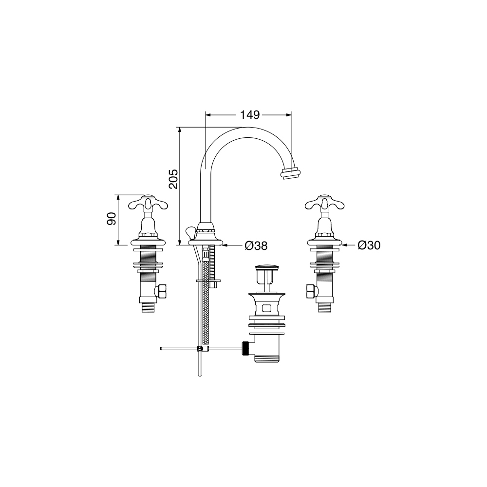 batteri 3-hullers håndvask med høj tud og afløb..