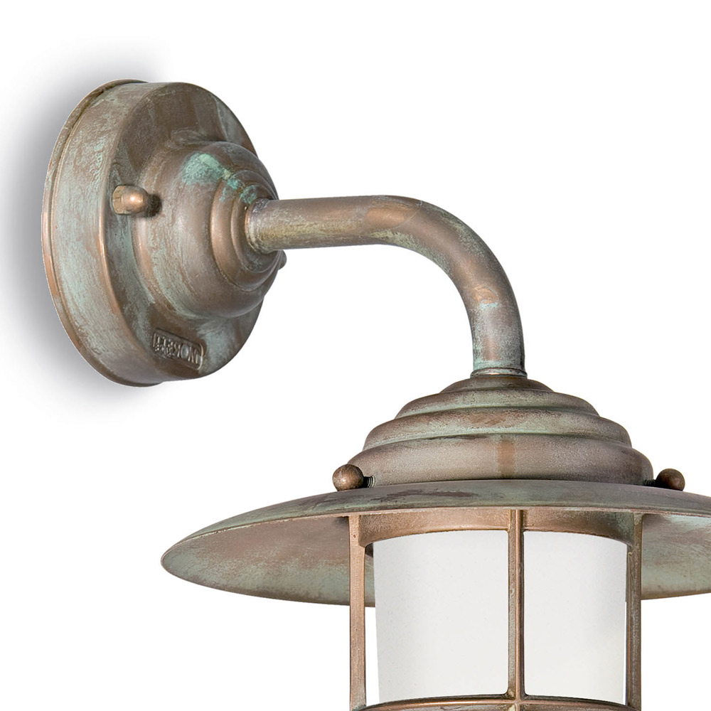 Inspireret af klassiske udendørs lanterner kombinerer denne væglampe i messing traditionelt håndværk og tidløs elegance . Messingstrukturen , udsmykket med antikke finish , fremhæver metallets materialekarakter og tilføjer personlighed til enhver arkitektonisk kontekst.