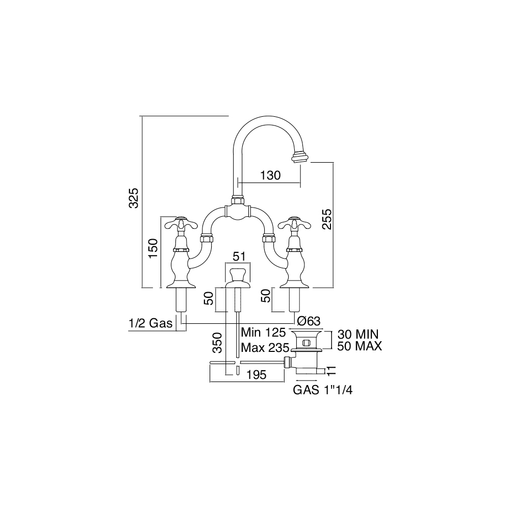 broformet håndvaskarmatur med 2-3 huller med afløb, justerbar centerafstand og leddelt tud.