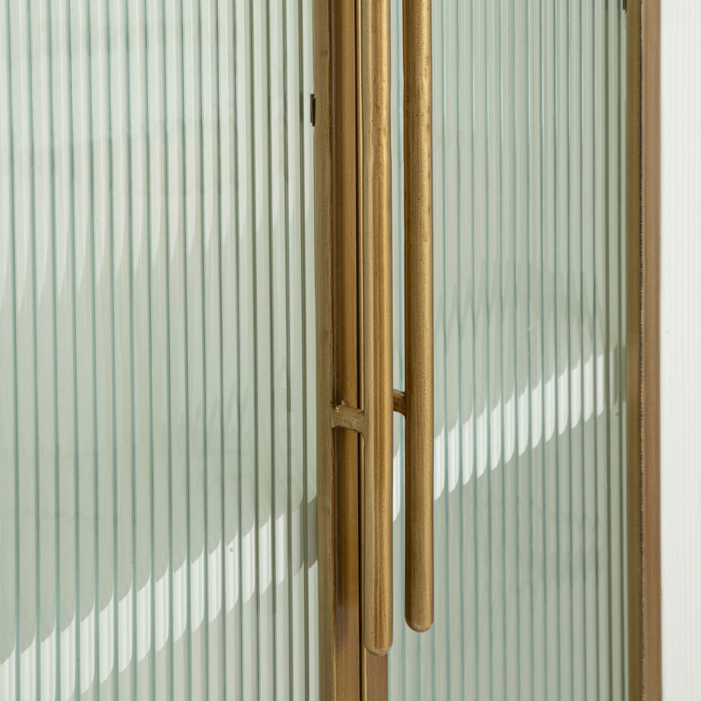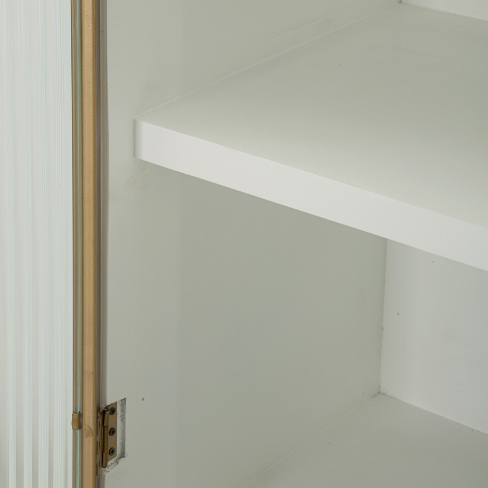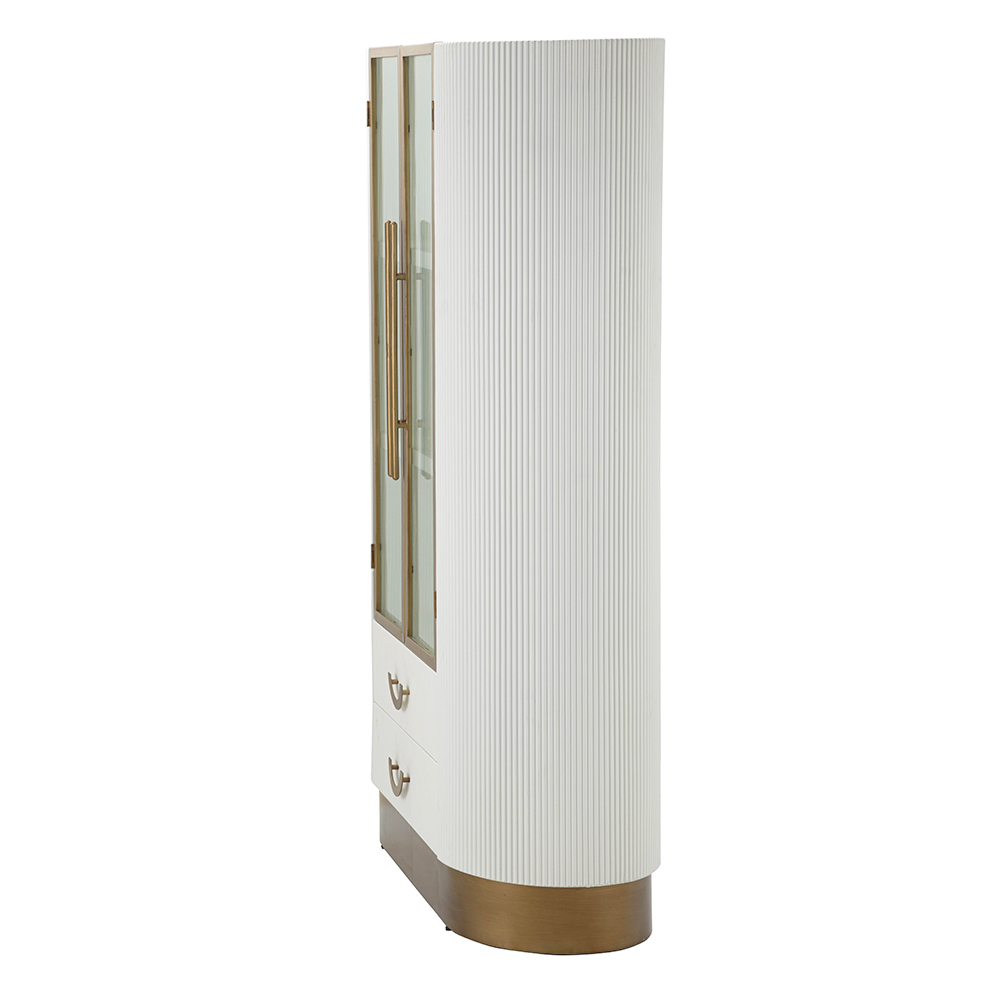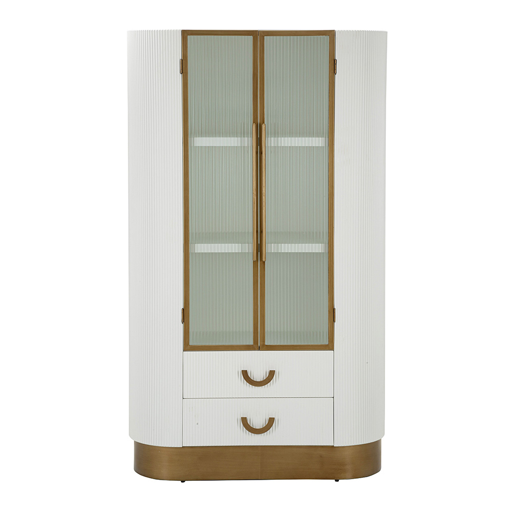 Den hvide finish med lodrette rillede detaljer giver et strejf af visuel tekstur og dybde , mens linjerne i bunden og håndtagene introducerer en varm kontrast, der løfter møblet yderligere. Dens afrundede former tilføjer en unik blødhed til miljøer, samtidig med at den tilbyder en generøs mængde opbevaringsplads, organiseret på en praktisk måde med indvendige hylder og rummelige skuffer.
