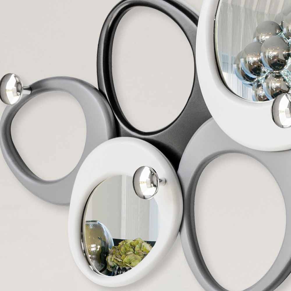 Formet struktur med overlappende elementer, tre sorte lakeret spejle, dyve grå og elfenben, fem knapper.
